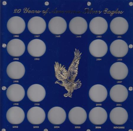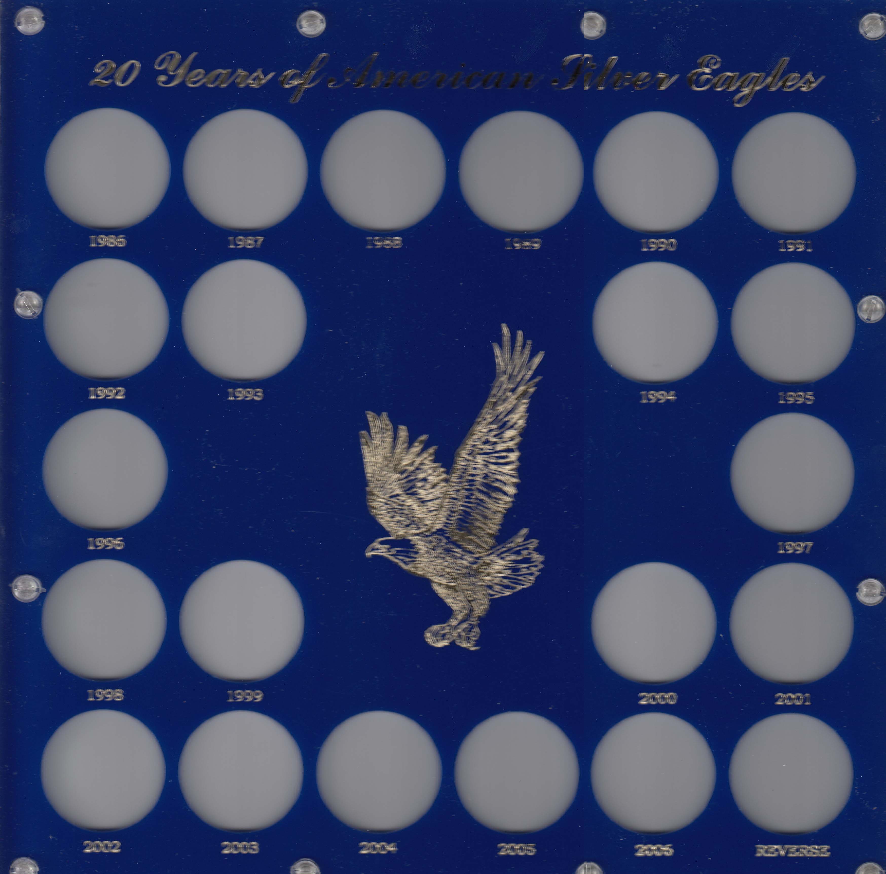Capital Plastics offers the largest selection of premium coin holders of any available brand. This holder measures 12x12 and is available only in blue. It features 22 holes for American Silver Eagles from 1986 to 2006 and one additional hole to show the reverse.