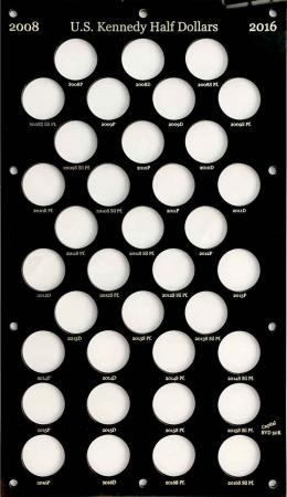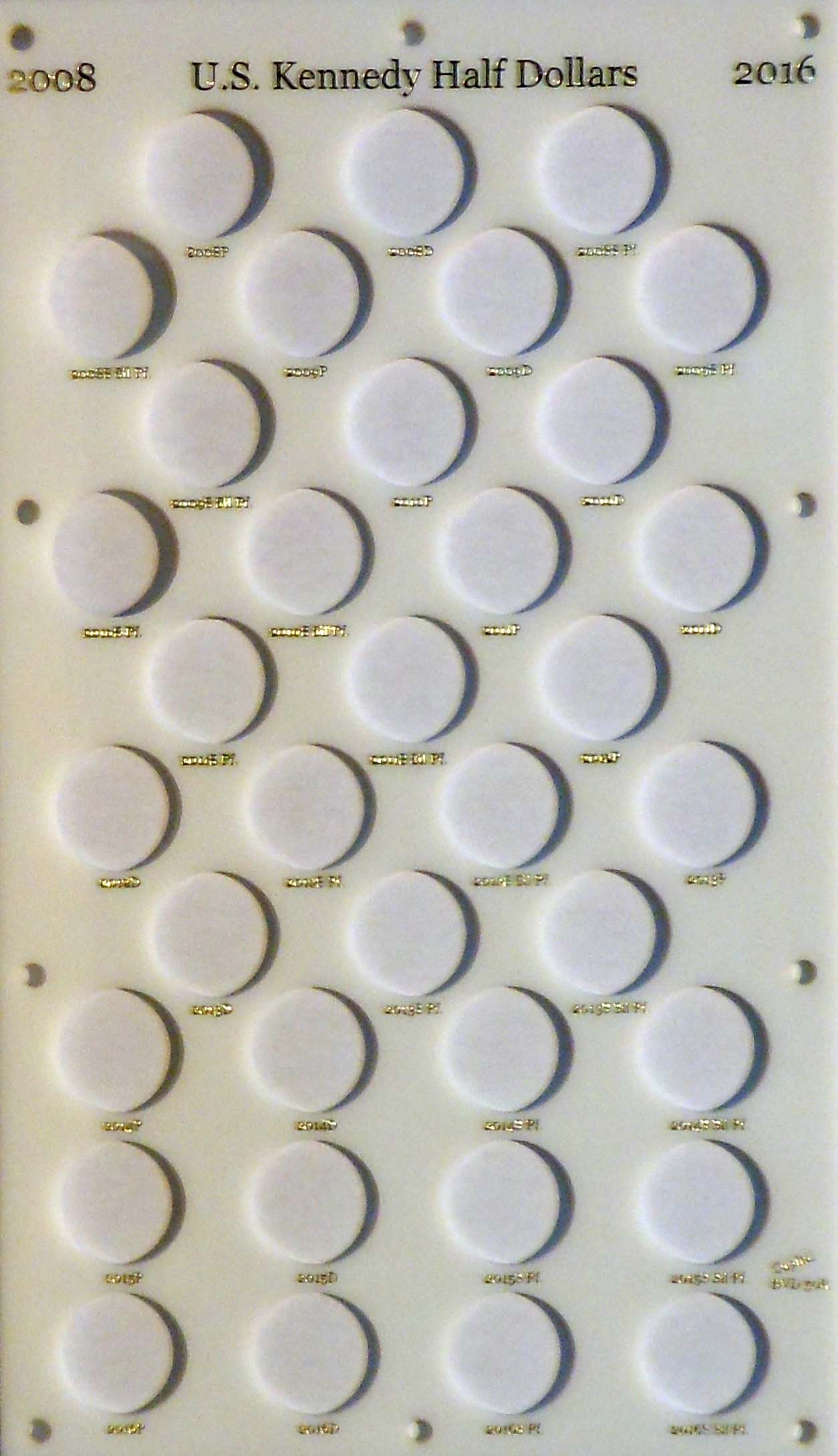 Capital Plastics offers the largest selection of premium coin holders of any available brand. This holder has holes for the Kennedy Half Dollars from 2008 to 2016. It includes holes for the proof only issues. Sized to fit inside a bank vault drawer.