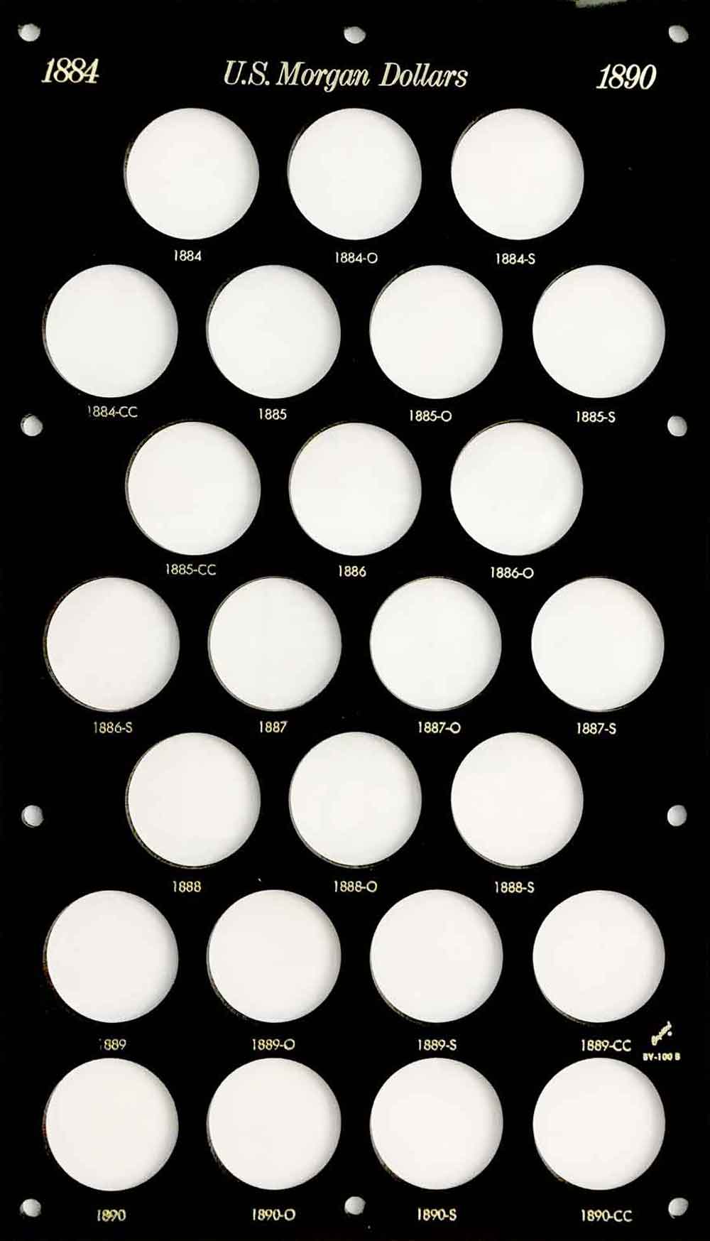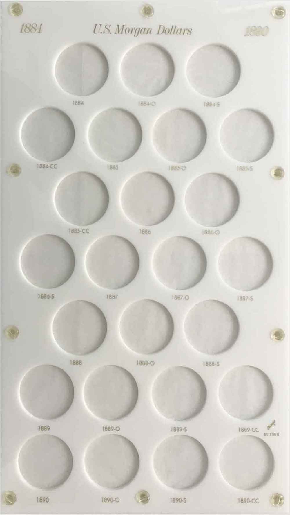 Capital Plastics offers the largest selection of premium coin holders of any available brand. This holder has 25 holes for Morgan Dollars dated from 1884 to 1890-CC. Sized to fit inside a bank vault drawer.