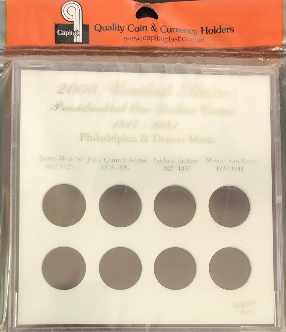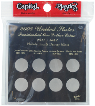 Capital Plastics offers the largest selection of premium coin holders of any available brand. This is Capital's Galaxy style snap together holder with eight holes for P-mint and D-mint versions of the Presidential Dollars issued in 2008.
