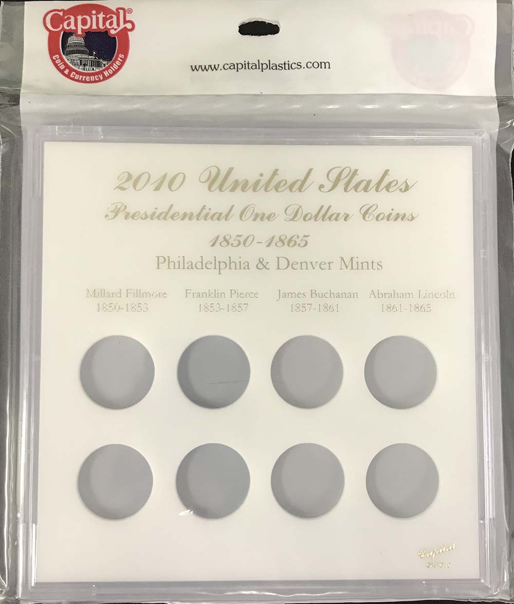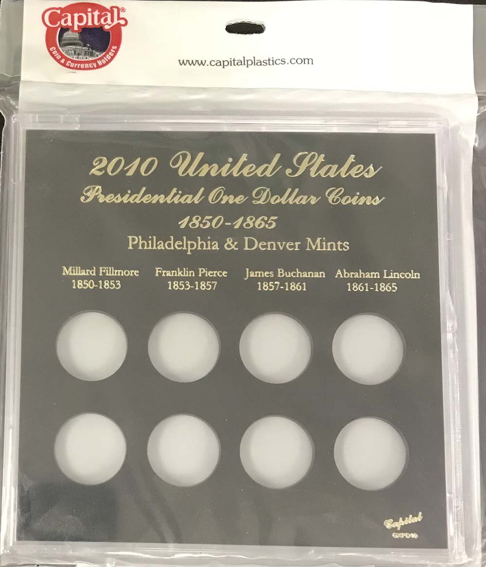 Capital Plastics offers the largest selection of premium coin holders of any available brand. This is Capital's Galaxy style snap together holder with eight holes for P-mint and D-mint versions of the Presidential Dollars issued in 2010.