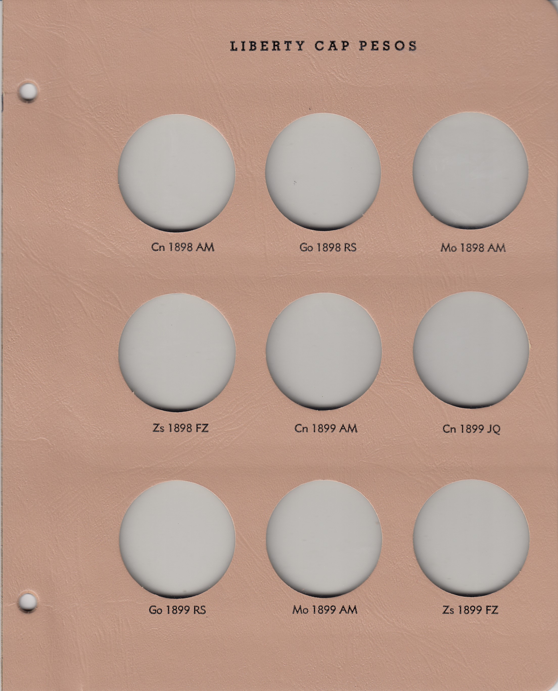 Dansco Replacement pages are used to update older versions of albums or replace worn pages. This page holds Mexican Liberty Cap Pesos from 1898 to 1899 and replaces page 1 in Dansco Album 7229: Mexico Liberty Cap Peso, 1898-1909.