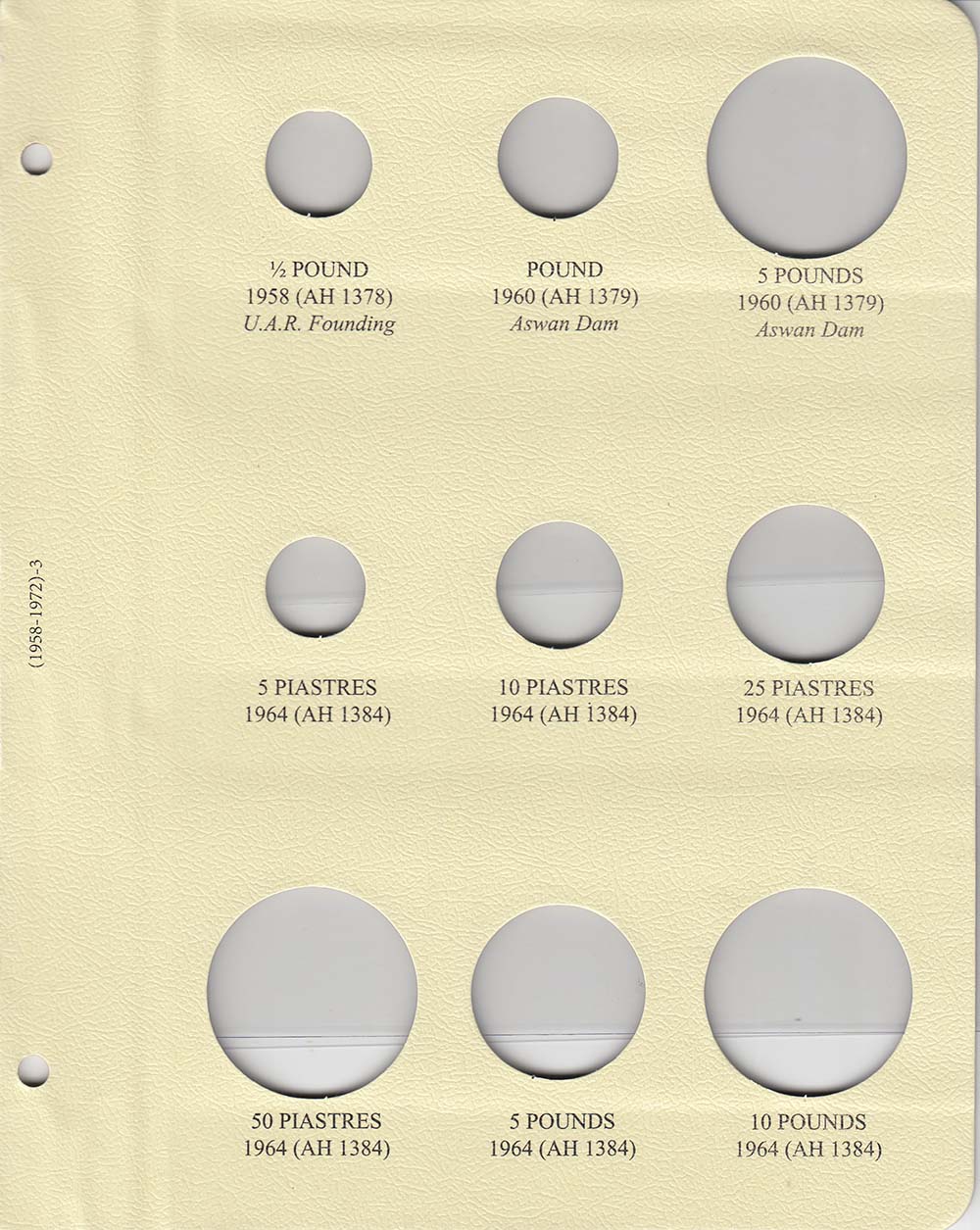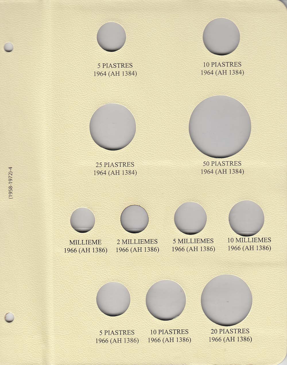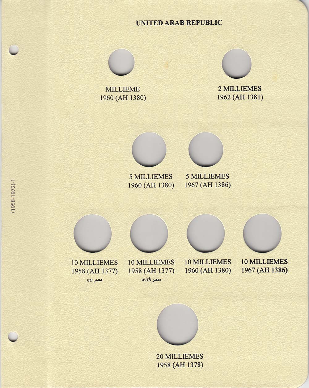 This album consists of 6 pages and contains a total of 51 slots. These slots are designed to house coins issued by Egypt between 1958 and 1972, with the correct diameters and dates for all known varieties.