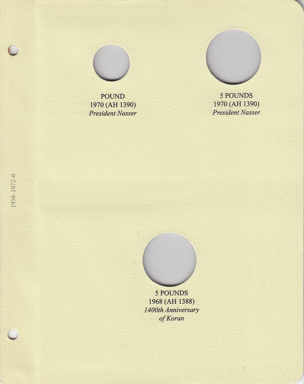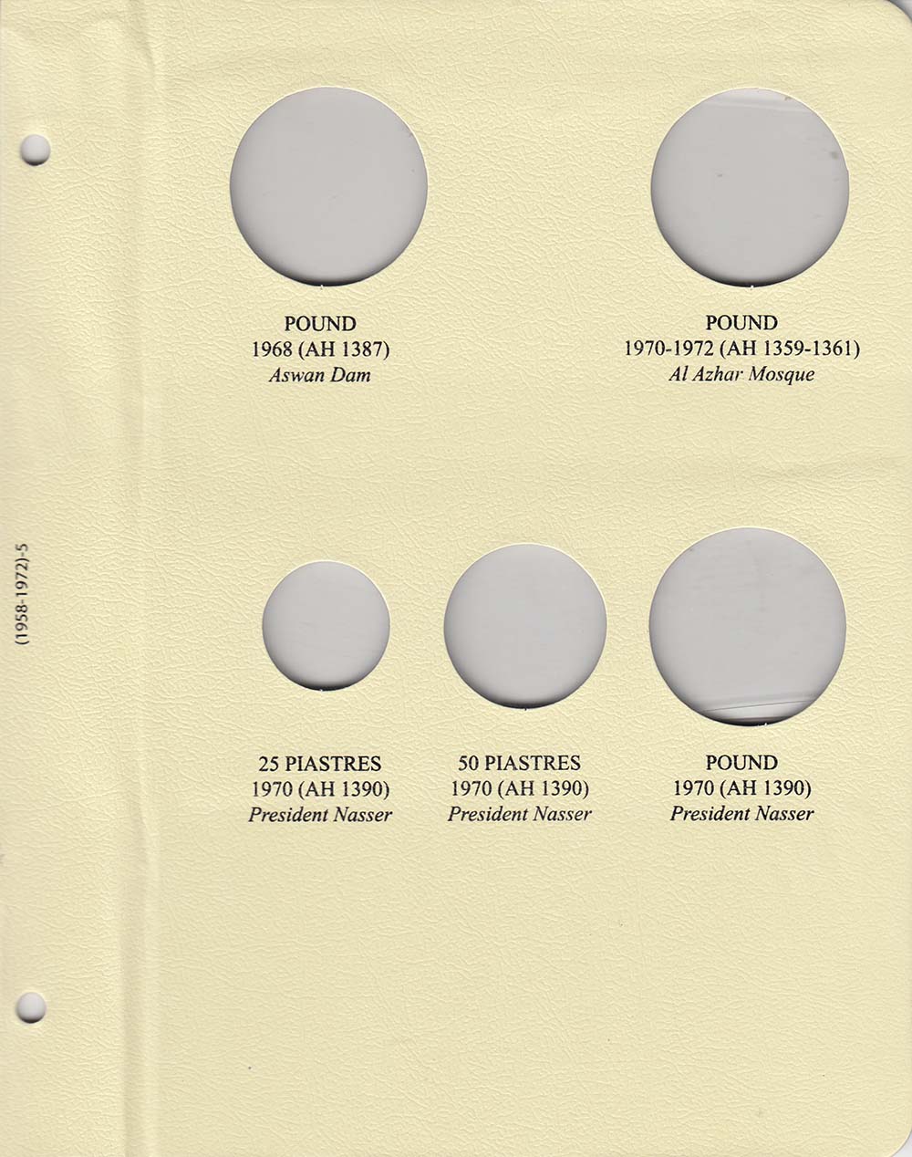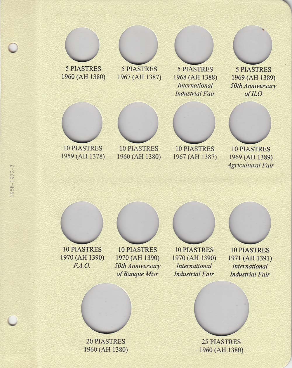 This album consists of 6 pages and contains a total of 51 slots. These slots are designed to house coins issued by Egypt between 1958 and 1972, with the correct diameters and dates for all known varieties.