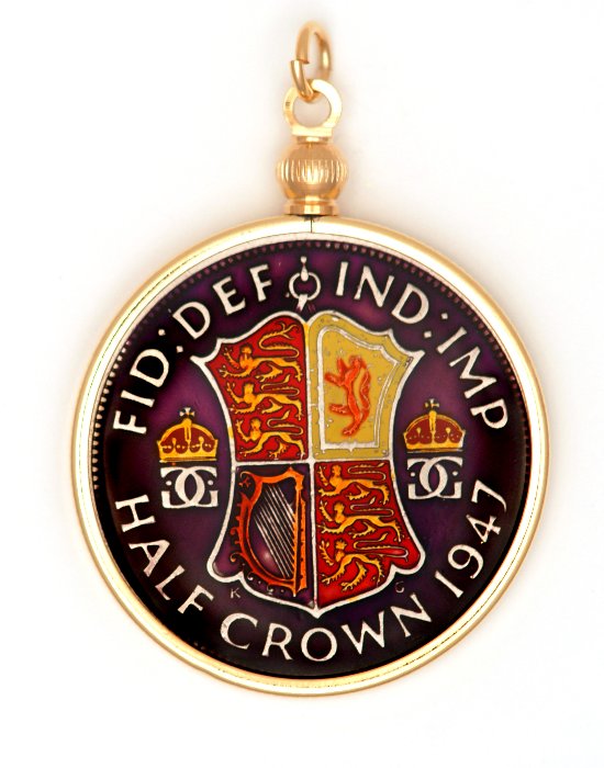 Each piece in our line of hand painted coin and medallion jewelry is crafted from a genuine coin or medallion. The multi-color hand painting comes from a very old art form from a family of artists. This family is the only known family of artists in the United States making these beautiful pieces, each of which is a gift or keepsake to treasure forever. The artists of this family have carefully selected each coin and medallion and, choosing from a selection of miniature curved and straight brushes, hand painted every minute detail that already existed on the coin or medallion. In painstaking fashion, the artists have applied color initially to the background to outline the design, followed by a high tempature firing process. The firing process is repeated after each color is applied. The hand-painting process for each piece varies with some taking as long as two days to complete. In the final stage, in order to protect the delicate hand painting, the artists have applied and baked on a covering of space age plastic, which also adds depth and luster to the item while providing protection forever.