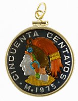 Hand Painted Mexico 50 Centavos Aztec Warrior Pendant