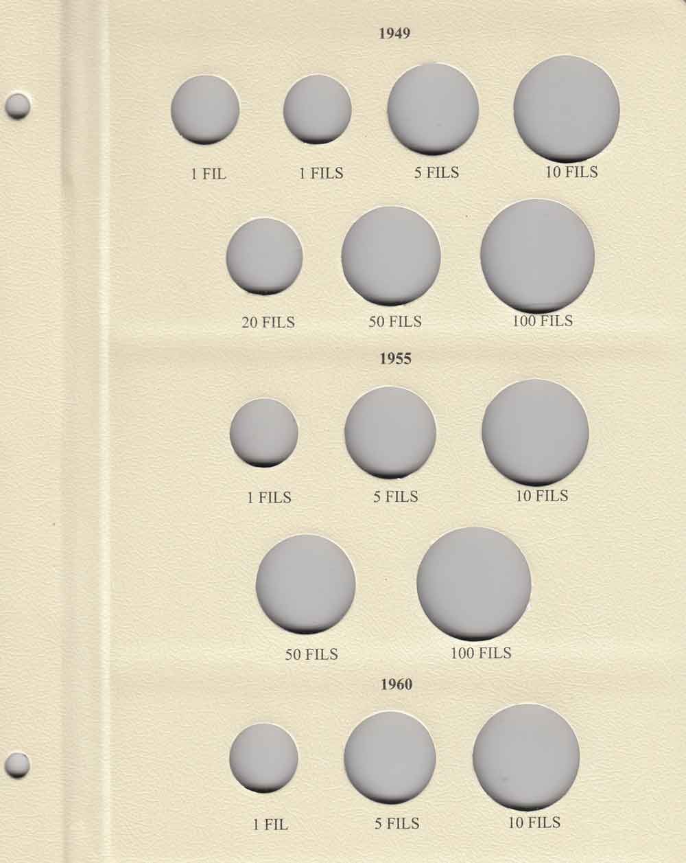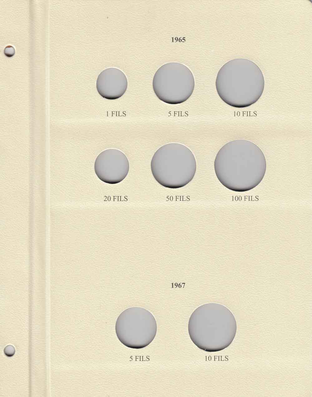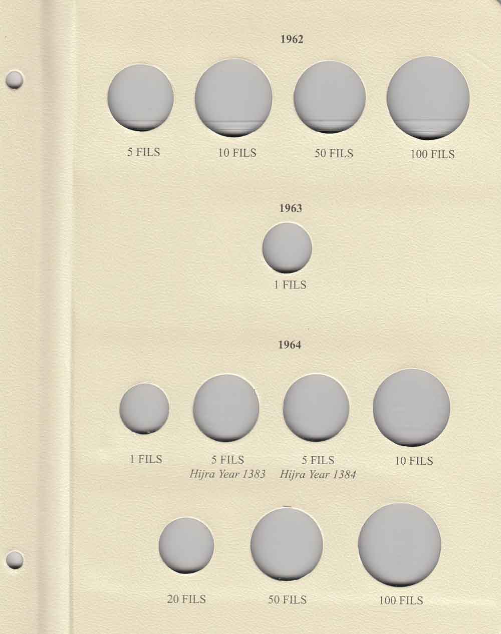 This album consists of 3 pages and contains a total of 35 slots. These slots are designed to house coins issued by Jordan between 1949 and 1967, with the correct diameters and dates for all known varieties.