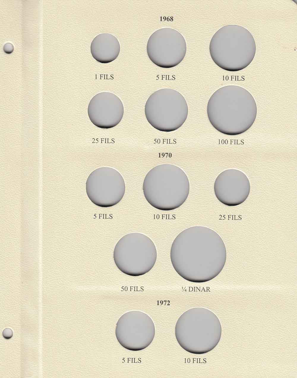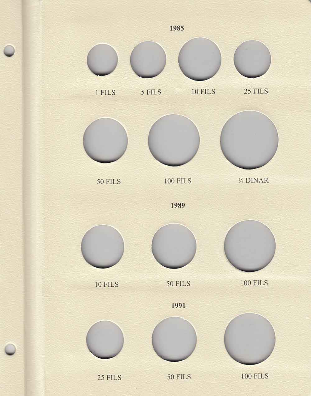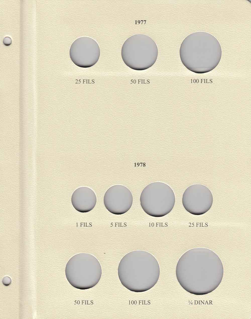 This album consists of 5 pages and contains a total of 56 slots. These slots are designed to house coins issued by Jordan between 1968 and 1991, with the correct diameters and dates for all known varieties.