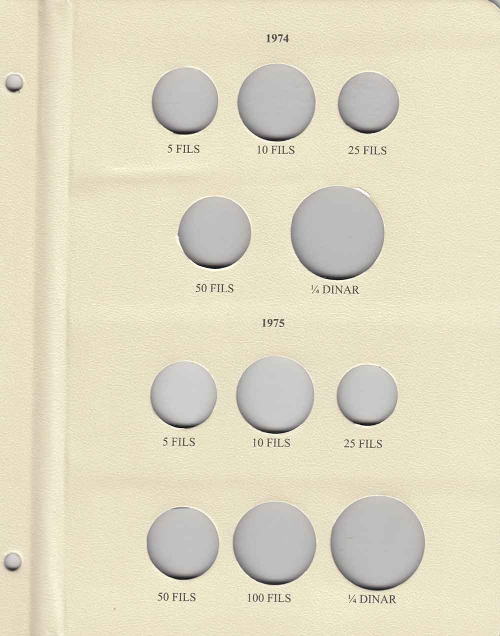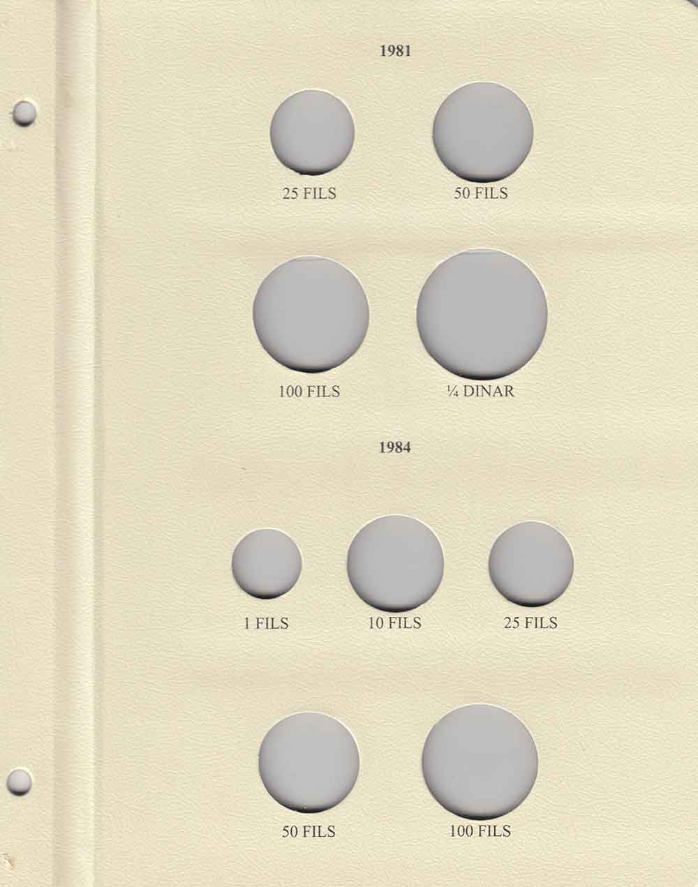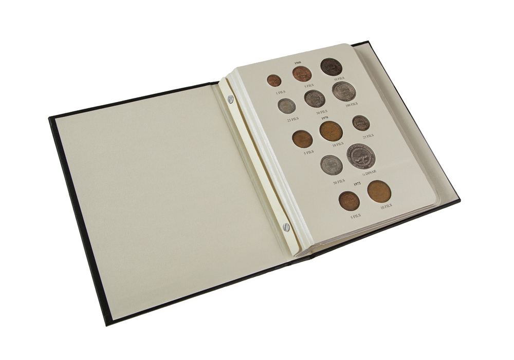 This album consists of 5 pages and contains a total of 56 slots. These slots are designed to house coins issued by Jordan between 1968 and 1991, with the correct diameters and dates for all known varieties.