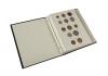 This attractive album as a deep brown colored binder with bright metallic gold imprint on the cover and the spine. The interior of the album is tan colored with black printing on both the pages and the inside covers. The pages feature clear acetate slides that cover and protect both sides of the coins while still allowing them to be viewed. The inside back cover has mintage information for the coins included in the album.