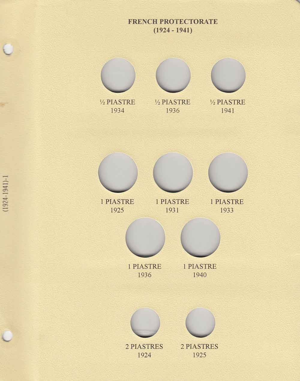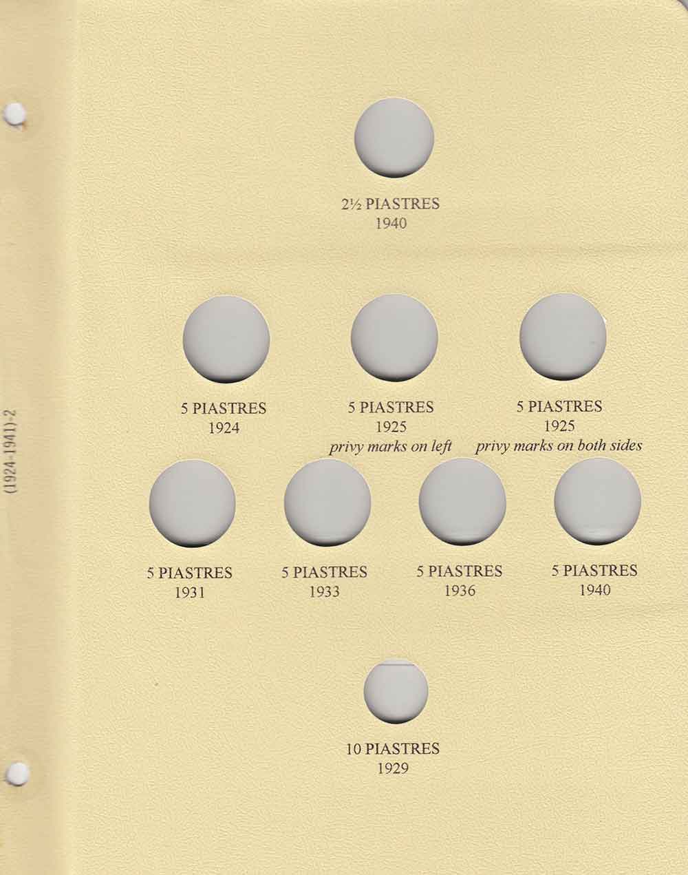 This album consists of 3 pages and contains a total of 29 slots. These slots are designed to house coins issued by Lebanon between 1924 and 1941, with the correct diameters and dates for all known varieties.