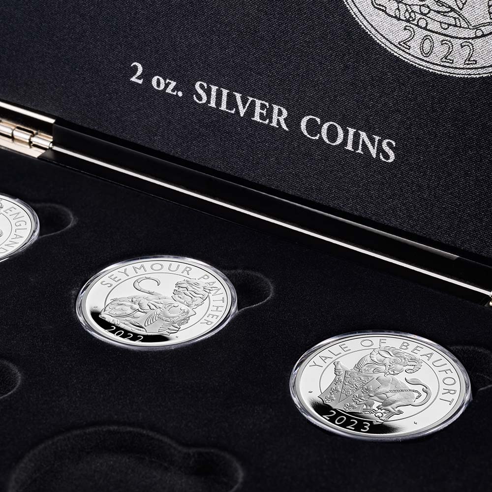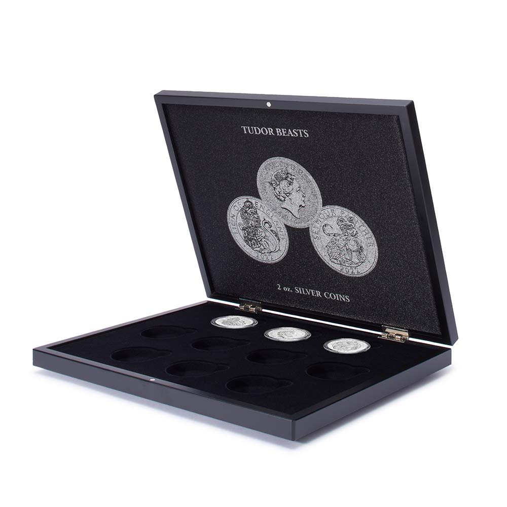 High-quality black coin case to store 10 Tudor Beasts silver coins (2 oz.). One inlay with black, velour-like surface and 10 round cavities that fit the coins in their original issued capsules, Lighthouse Perfect Fit Queens Beast Capsules or other capsules with 39mm inner diameter and 45mm outer diameter. Nobile, silver-colored lid and cushion print with coin motif. Lid cushion upholstered in black satin. Secure and unobtrusive magnetic closure.