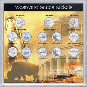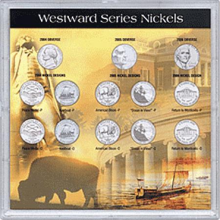This deluxe 6.5x6.5 frosty case features a backdrop of the Lewis and Clark expedition with thirteen holes for Westward Journey Nickels.
