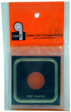 Capital Plastics offers the largest selection of premium coin holders of any available brand. The 3.3x3.3 style holder is vest pocket sized and made of clear molded plastic pieces that snap together around a black or white core with gold printing. It has a double gold border around the edge.