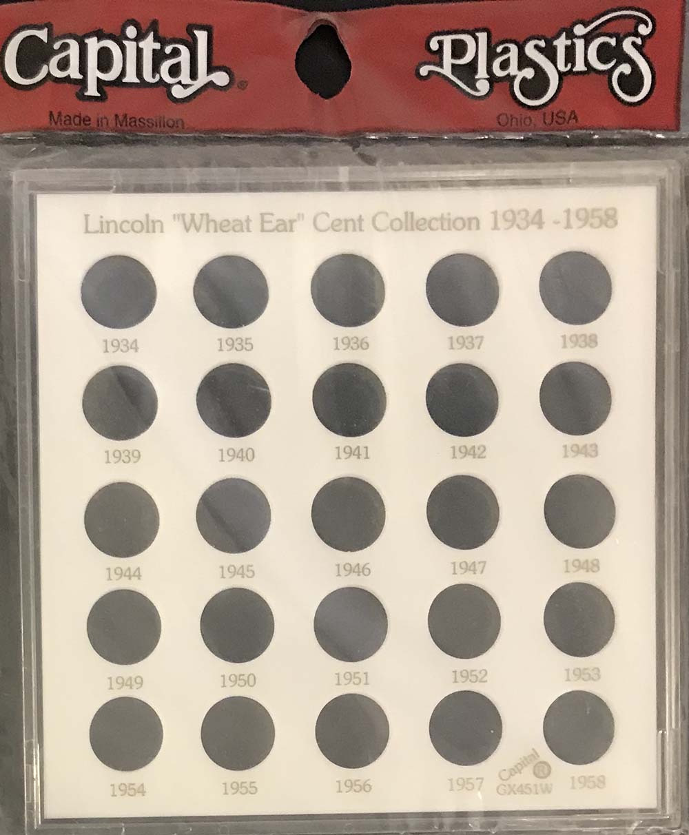 Capital Plastics offers the largest selection of premium coin holders of any available brand. This is Capital's Galaxy style snap together holder with 25 holes for Lincoln Wheat Cents from 1934 to 1958 (one per date).