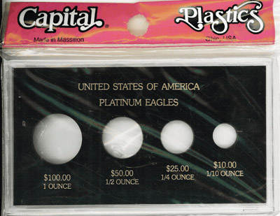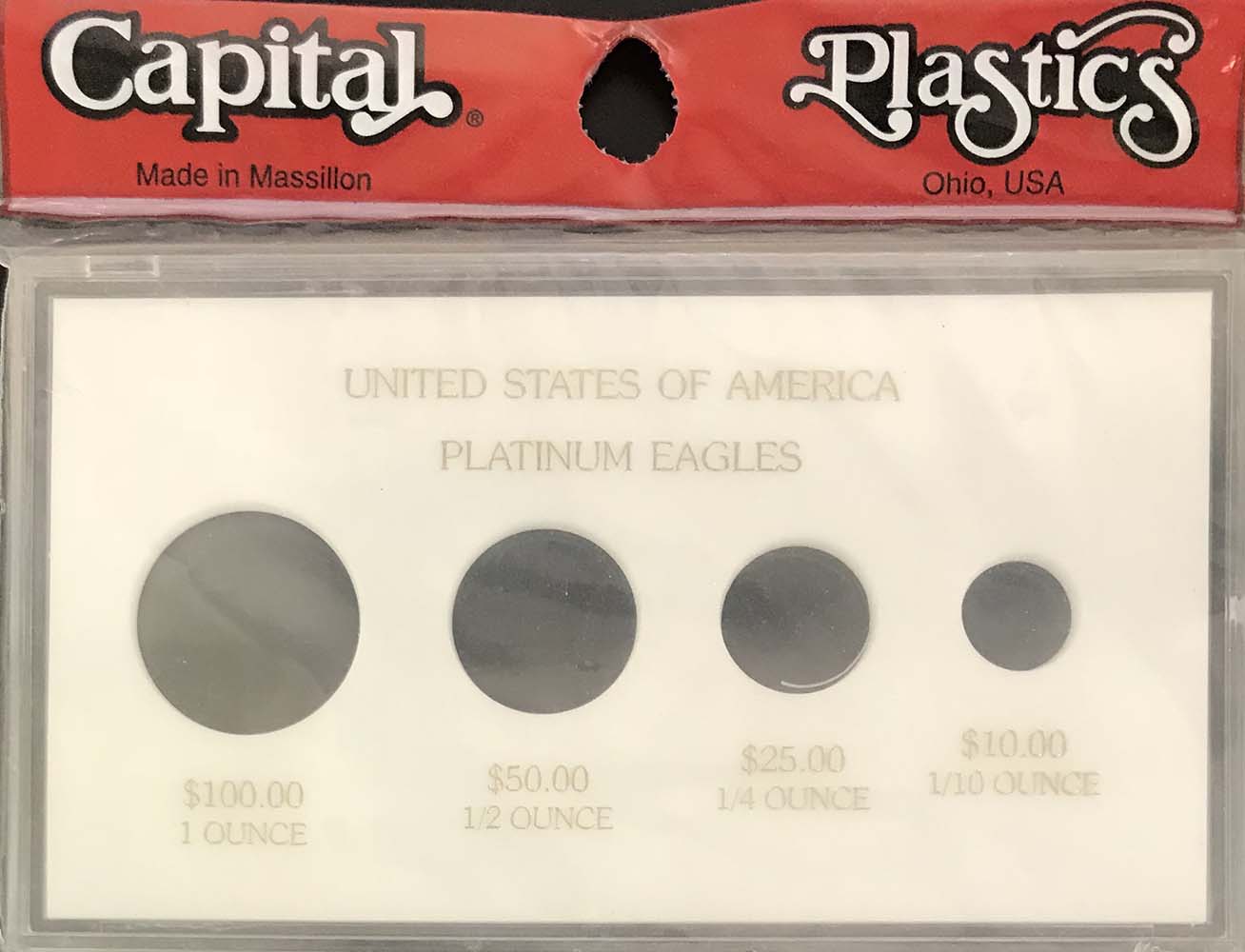 Capital Plastics offers the largest selection of premium coin holders of any available brand. This is Capital's Meteor style snap together holder with 4 holes for a set of Platinum Eagles (1 ounce, 1/2 ounce, 1/4 ounce and 1/10 ounce).