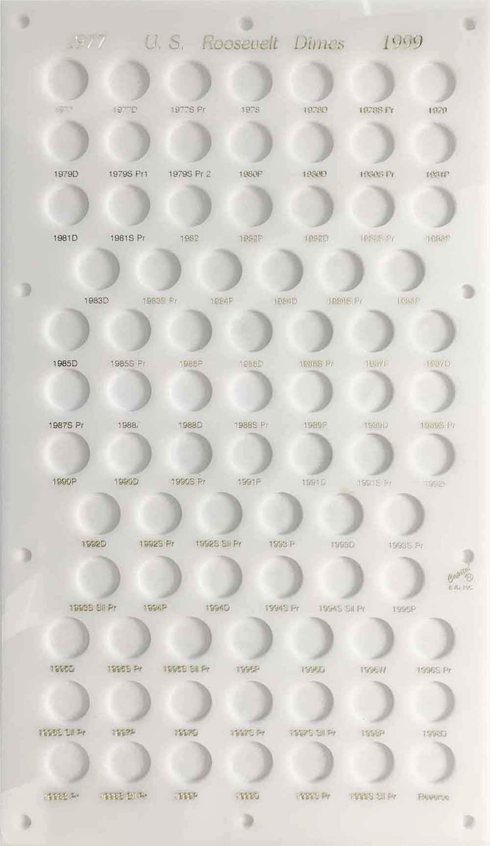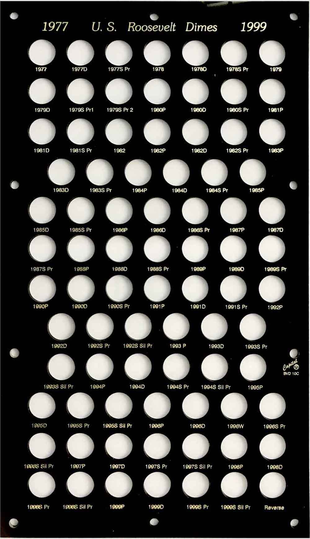 Capital Plastics offers the largest selection of premium coin holders of any available brand. This holder has 81 holes for the Roosevelt Dimes from 1977 to 1999. It includes holes for the proof only issues. Sized to fit inside a bank vault drawer.