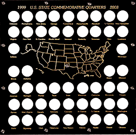 Capital Plastics offers the largest selection of premium coin holders of any available brand. This holder has 50 holes for the 50 State Washington Quarters from 1999 to 2008. It includes one hole per state and has an illustration of a US map.