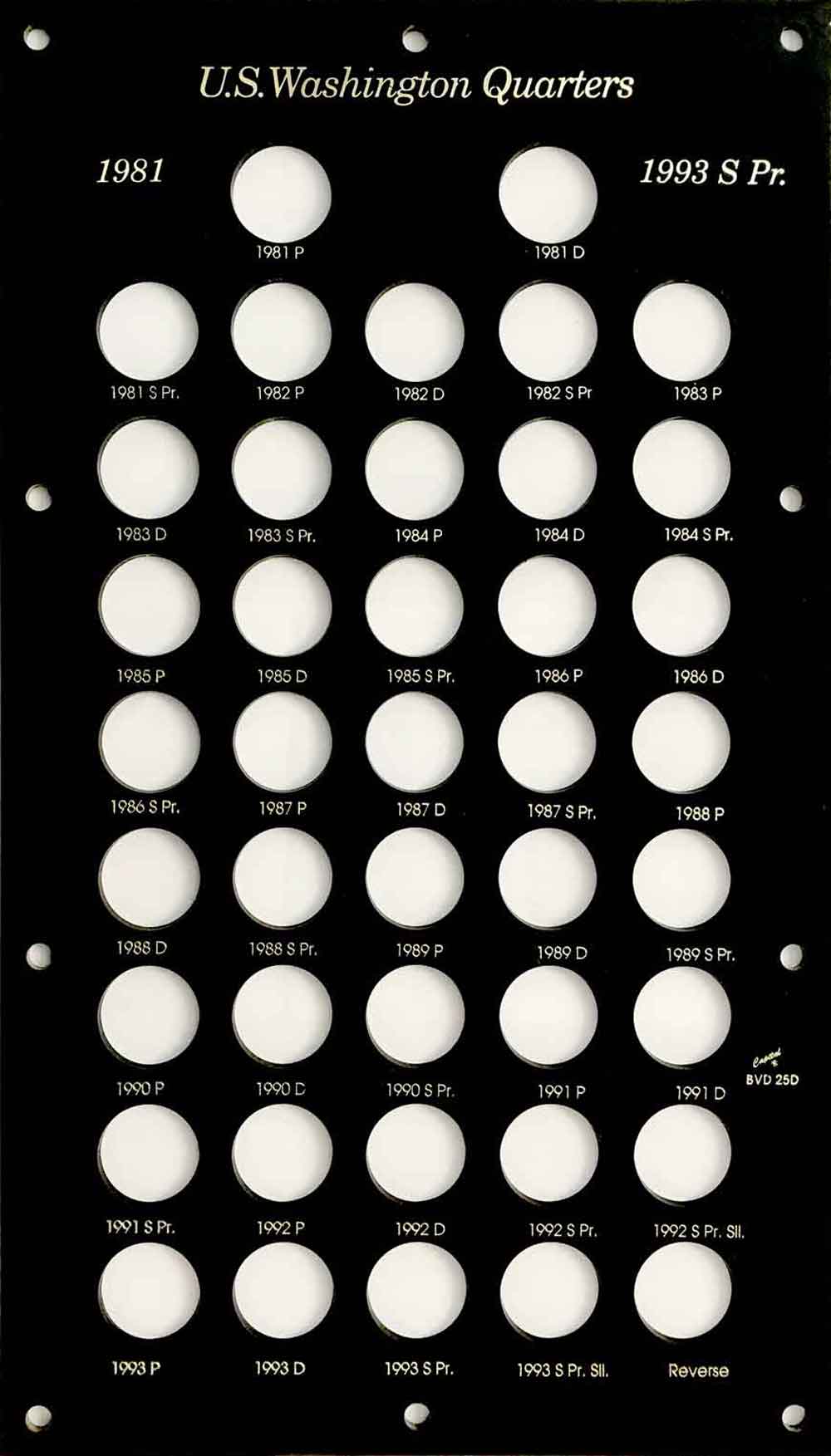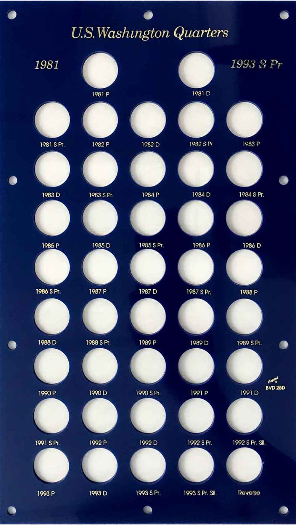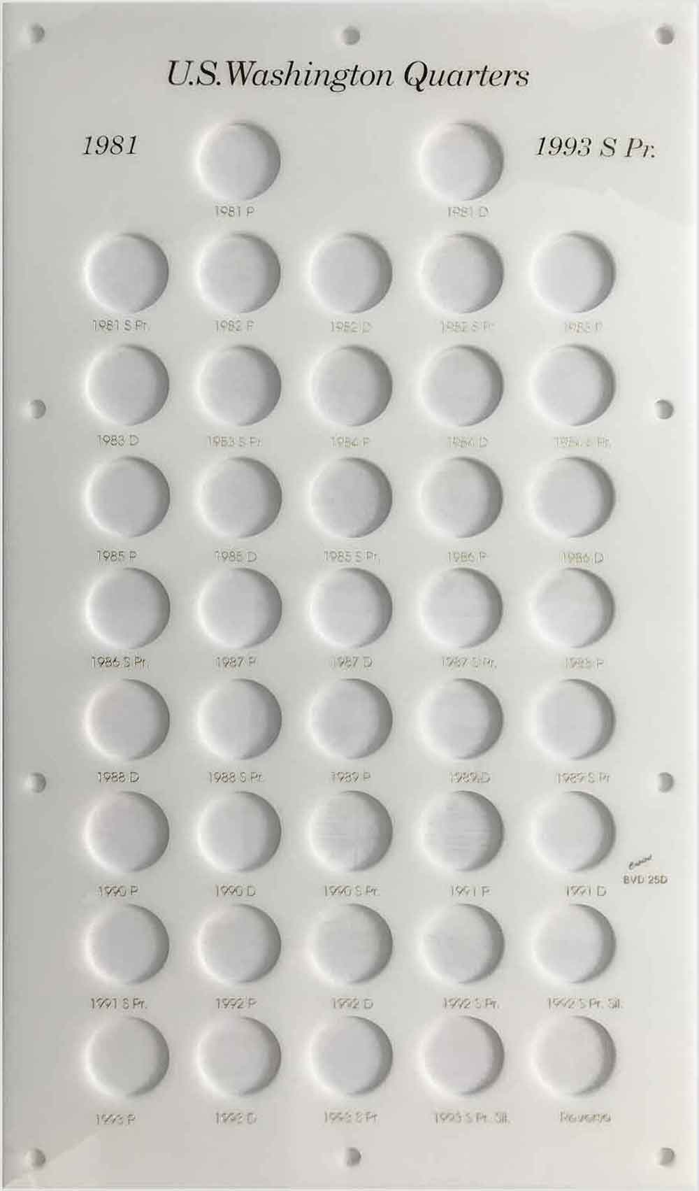Capital Plastics offers the largest selection of premium coin holders of any available brand. This holder has 42 holes for the Washington Quarters from 1981 to 1993S. It includes holes for the proof only issues. Sized to fit inside a bank vault drawer.