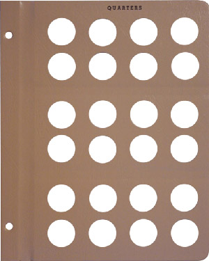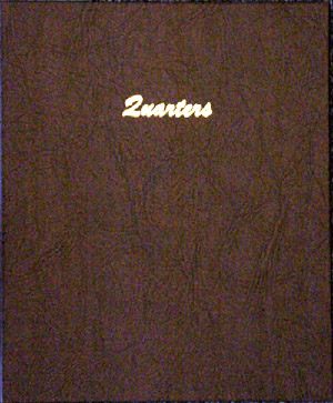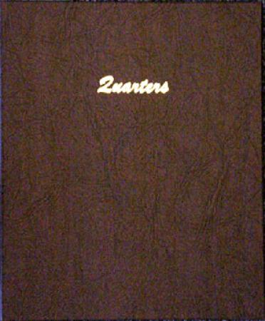 This Dansco Supreme Album for Quarters Plain (Dansco model number 7137) consists of a brown leatherette binder with loose-leaf hinged pages. The binder is gold stamped and the plastic coated pages are tan in color with black lettering. The pages are held in the binder with two posts that screw apart so that pages can be added, removed and replaced with ease. The album includes four pages with 24 ports on each page. Each page is titled Quarters but the individual ports are unlabeled. If a slip case is desired, the 5/8 inch slip case is the proper size for this album.
