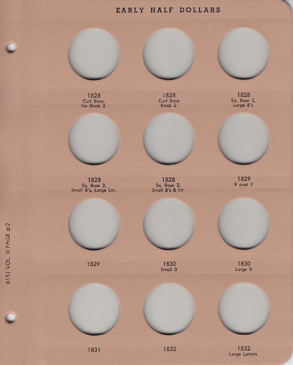 Dansco Replacement pages are used to update older versions of albums or replace worn pages. This page is page 2 of volume 2 of the two volume Early Half Dollars album (Dansco model 6151) for Early Half Dollars from 1828 to 1832.