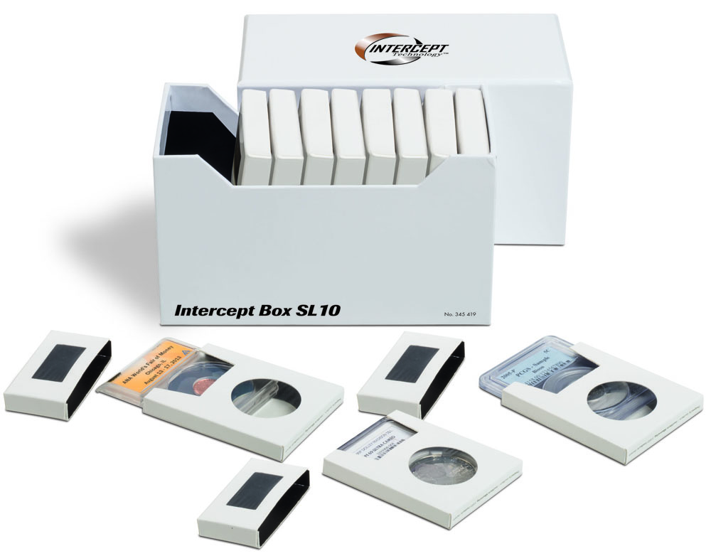 These Intercept Shield boxes for certified coins offer superb protection for your certified coins. Each box contains ten individual smaller boxes. All eleven boxes are lined with Intercept Shield, a breakthrough technology protecting your valuable coins from environmental damage. With the ten smaller boxes fitting inside the larger one, you get double protection from two Intercept Shield layers in a handy storage container. Each box will protect ten PCGS, NGC or ICG graded coins. The boxes are 3-1/4 inches wide by 3-3/4 inches tall by 6-1/2 inches long. Intercept Shield acts as a neutralizing agent cleansing the air around the coin protecting it from the harmful effects of corrosion.