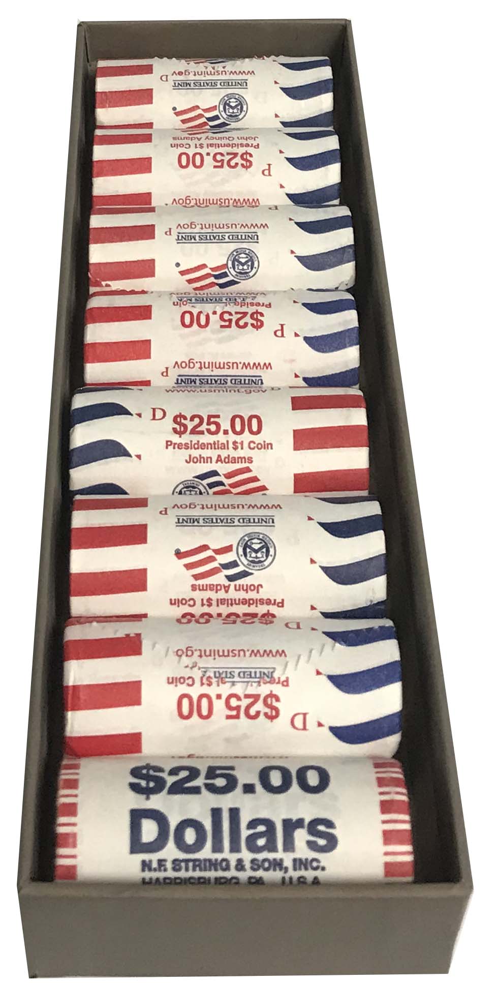 This heavy duty chipboard storage box is designed for paper-wrapped rolls of coins. The boxes are color coded by denomination using the American Banking Association standard colors.