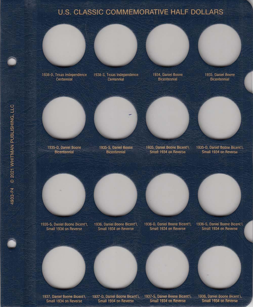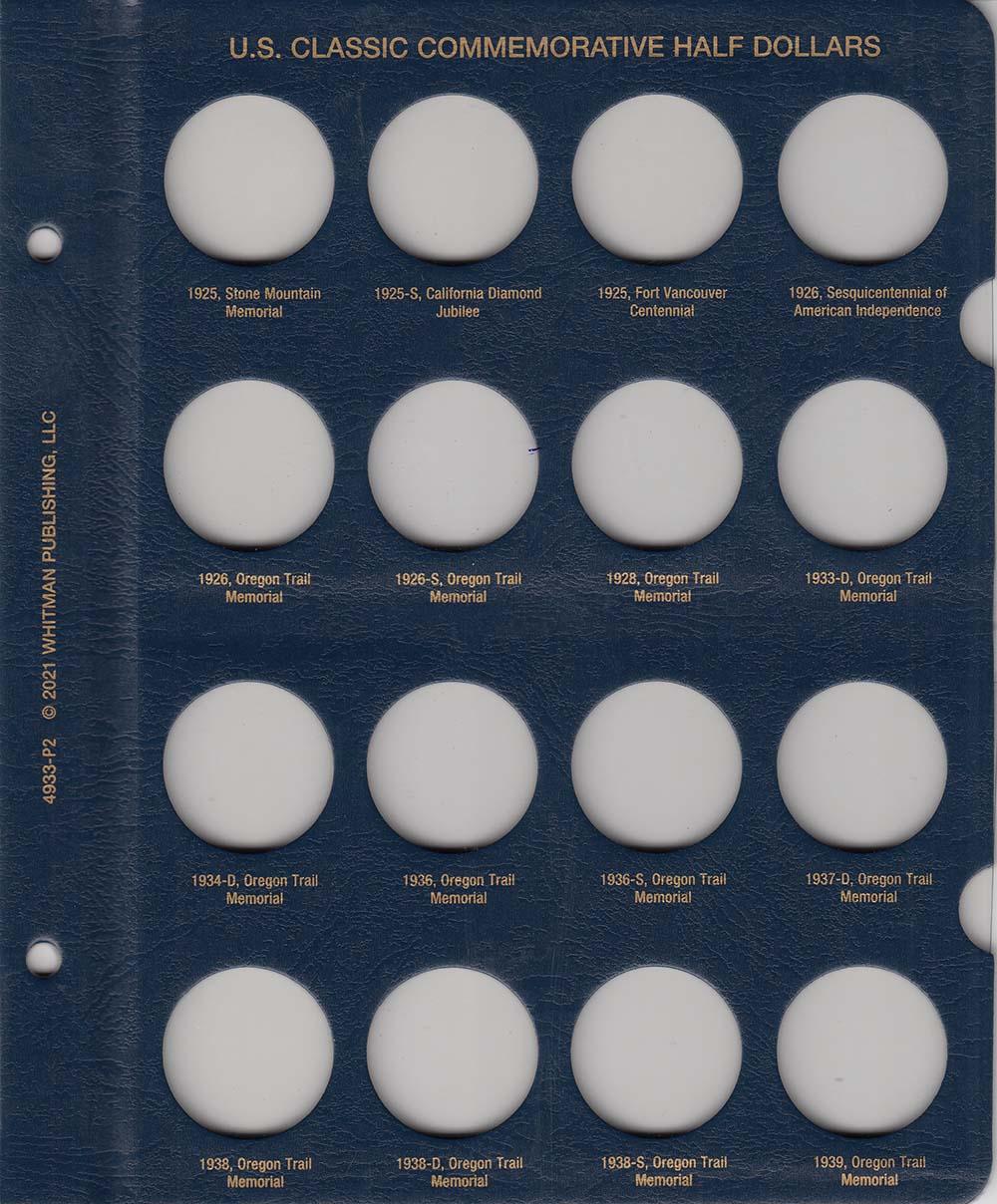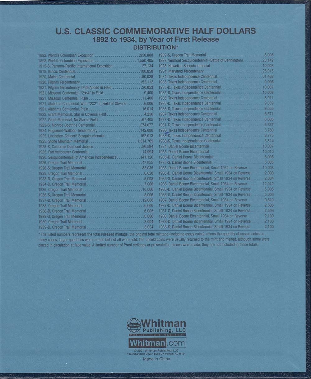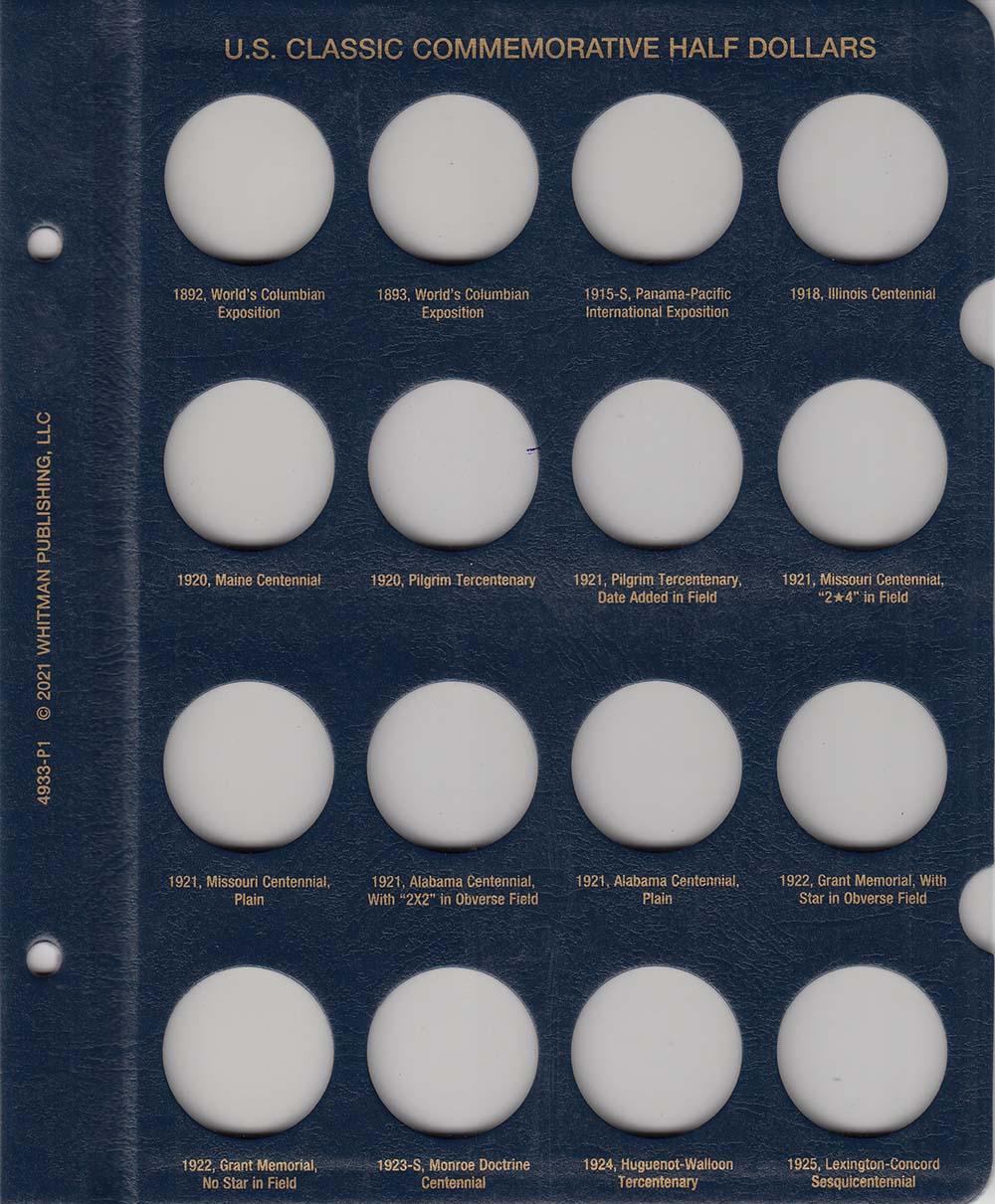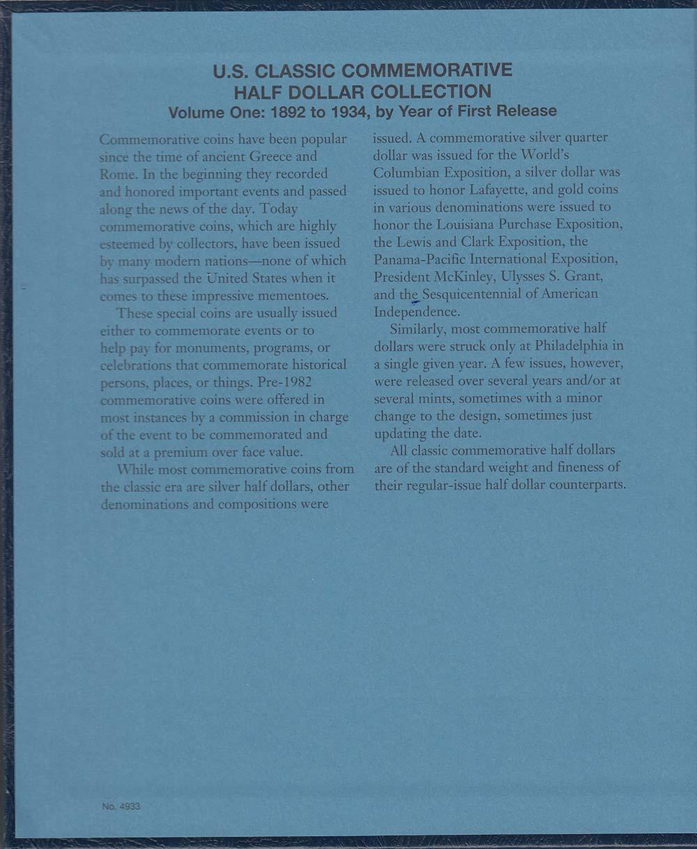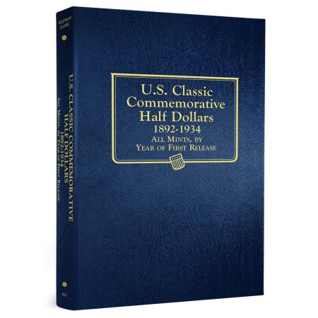 This is Volume I of two available volumes that cover the entire series of Classic Commemorative Half Dollars. The coins are arranged within the albums by year of issue (or year of first issue in the case of commemorative programs that spanned multiple years), rather than alphabetically. Volume I covers commemorative series that began from 1892 to 1934 and Volume II covers commemorative series that began from 1935 to 1954.
