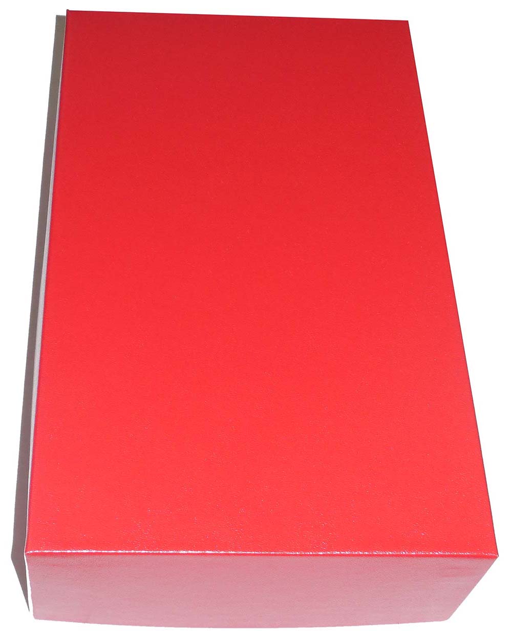 These 7-inch long boxes will hold up to 600 dealer cards or glassine envelopes. They are constructed of sturdy .040 point board and wrapped with red embossed paper that will not peel.