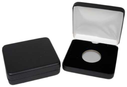 These boxes are wrapped with a black leatherette material and are manufactured with a hinged lid. Each box has a white satin cover pad, black display card, reflector card and a white protective sleeve. The display card has a hole sized for an A-size Air-Tite holder.
