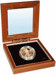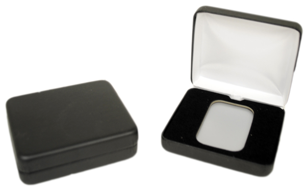These boxes are wrapped with a black leatherette material and are manufactured with a hinged lid. Each box has a white satin cover pad, black display card, reflector card and a white protective sleeve. The display card has a hole sized for a Bar size Air-Tite holder.