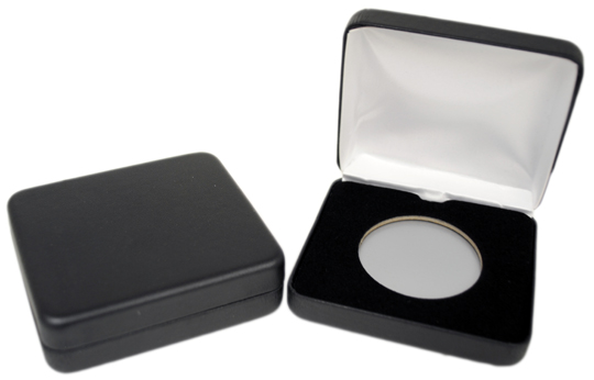 These boxes are wrapped with a black leatherette material and are manufactured with a hinged lid. Each box has a white satin cover pad, black display card, reflector card and a white protective sleeve. The display card has a hole sized for an H-size Air-Tite holder.