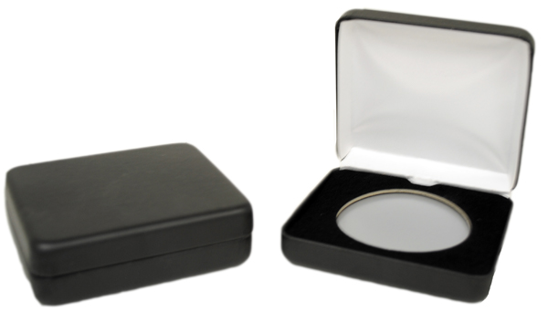 These boxes are wrapped with a black leatherette material and are manufactured with a hinged lid. Each box has a white satin cover pad, black display card, reflector card and a white protective sleeve. The display card has a hole sized for an X-size Air-Tite holder.