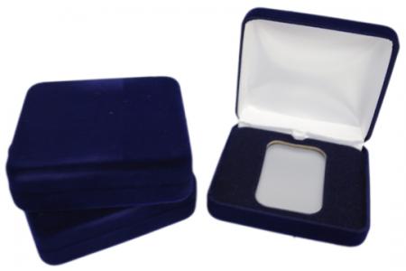 These boxes are wrapped with a blue velvet material and are manufactured with a hinged lid. Each box has a white satin cover pad, blue display card, reflector card and a white protective sleeve. The display card has a hole sized for an Bar Air-Tite holder.