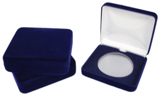 These boxes are wrapped with a blue velvet material and are manufactured with a hinged lid. Each box has a white satin cover pad, blue display card, reflector card and a white protective sleeve. The display card has a hole sized for an X-size Air-Tite holder.