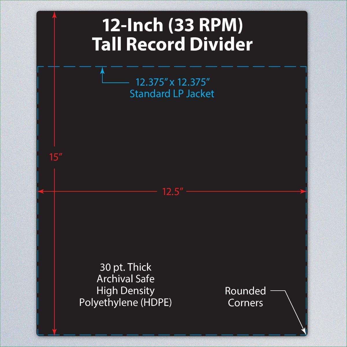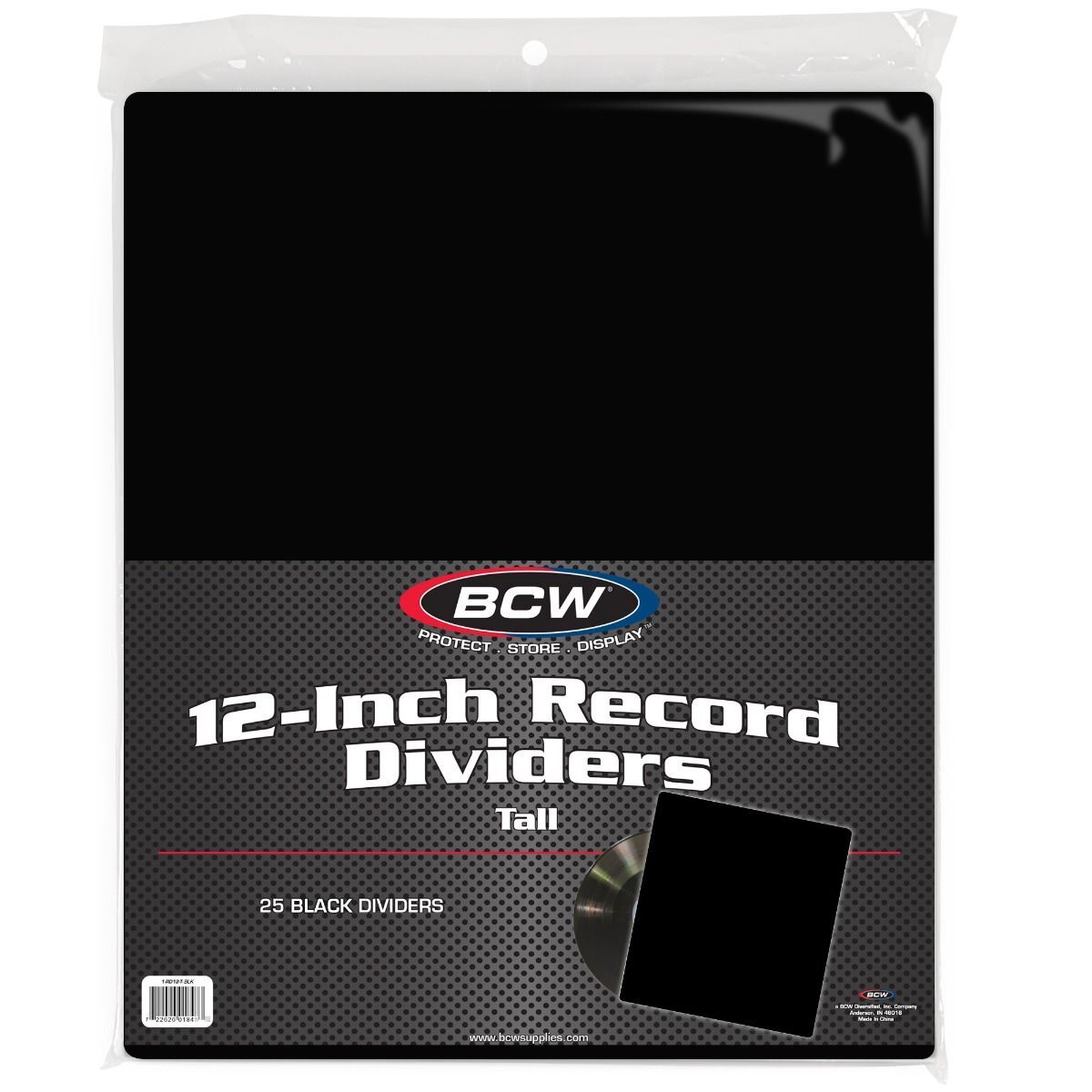 The tall 12" record dividers are made from the same 30-point, black, high-density, archival quality polyethylene plastic as our regular record dividers, but feature a 3" tall, full-width, ginormous, header. Dividers can be positioned with the header on top when the records are in a record boxes, crates, or bins, or the dividers can be turned with the header on the side to help organize vinyl records on shelves. These work great in an open BCW 33 RPM Record Storage Boxes and are easily visible to help sort your vinyl 12-inch LPs and Laserdiscs.