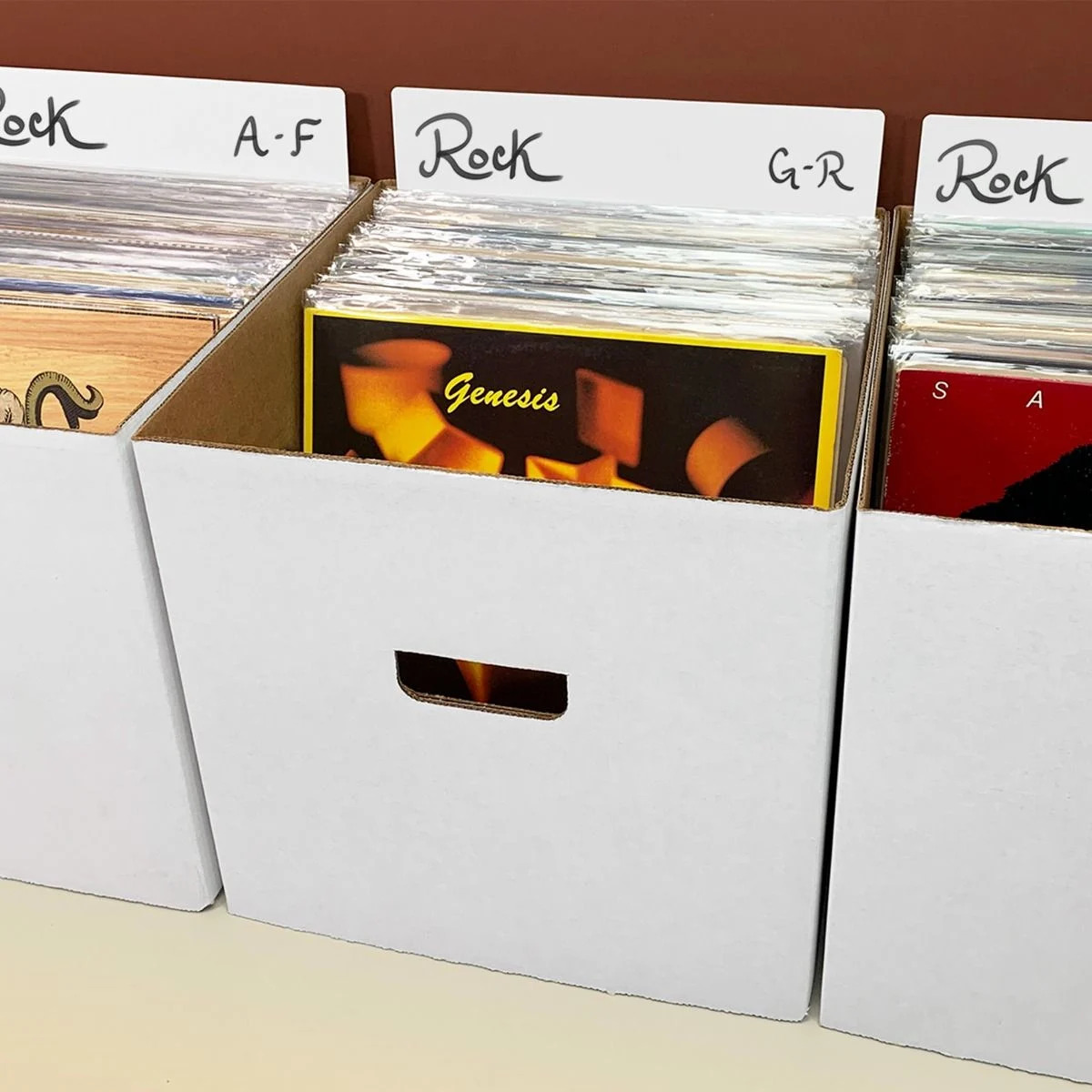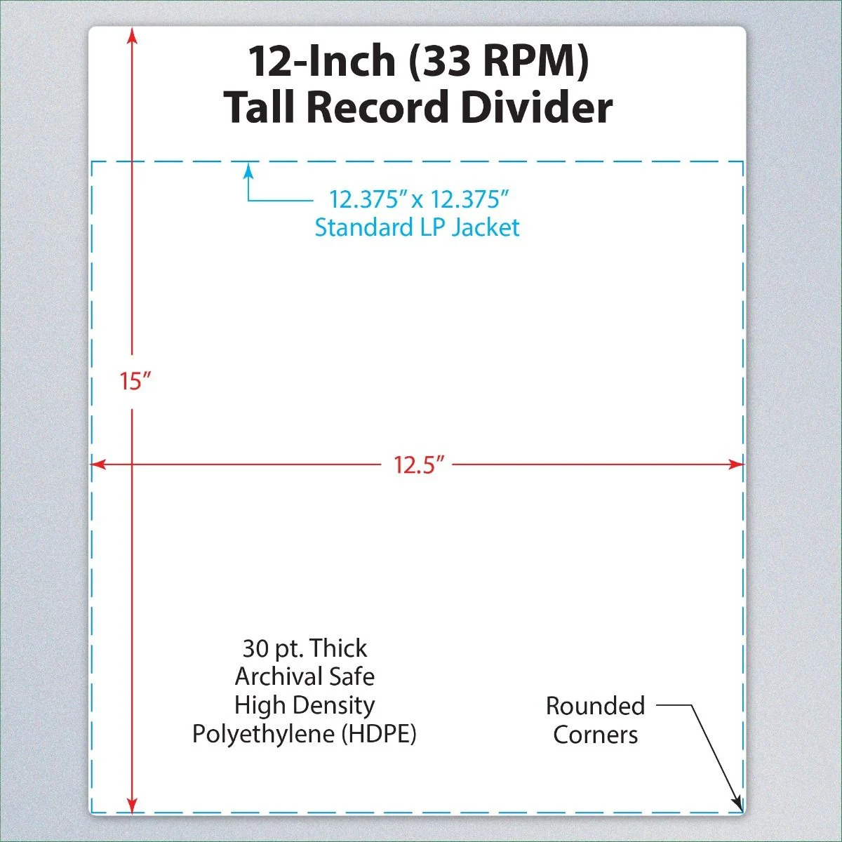The tall 12" record dividers are made from the same 30-point, white, high-density, archival quality polyethylene plastic as our regular record dividers, but feature a 3" tall, full-width, ginormous, header. Dividers can be positioned with the header on top when the records are in a record boxes, crates, or bins, or the dividers can be turned with the header on the side to help organize vinyl records on shelves. These work great in an open BCW 33 RPM Record Storage Boxes and are easily visible to help sort your vinyl 12-inch LPs and Laserdiscs.