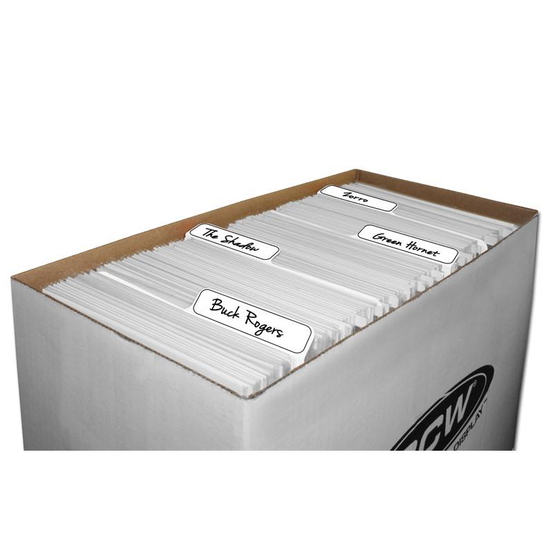 The colored BCW Comic Dividers are made from a full 30-point, high-density Polyethylene Plastic (archival quality), with write-on index tab, and are precision cut to size. These dividers feature a creased tab that can be folded over so that the dividers fit into a box while the lid is on. Sold in packs of 25 dividers.