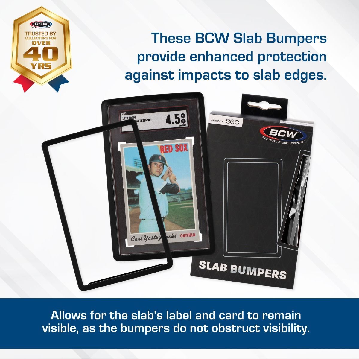 BCW Slab Bumpers are made from black durable, flexible silicone. They help protect not only the edges of your graded cards from chips and cracking but also the faces of your of your graded cards no longer rub against each other, keeping them in ideal, pristine condition. These are sized to fit standard SGC graded cards.