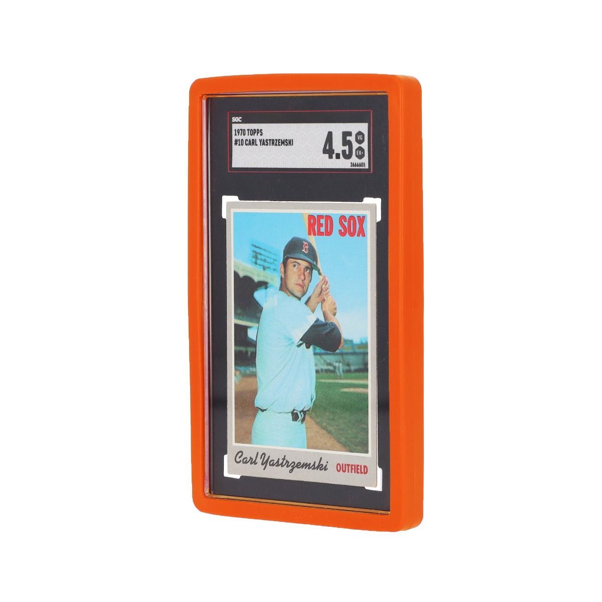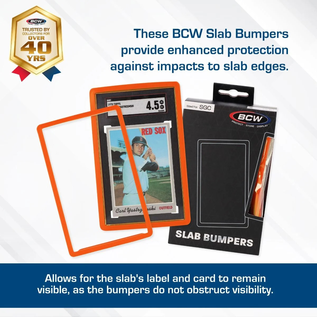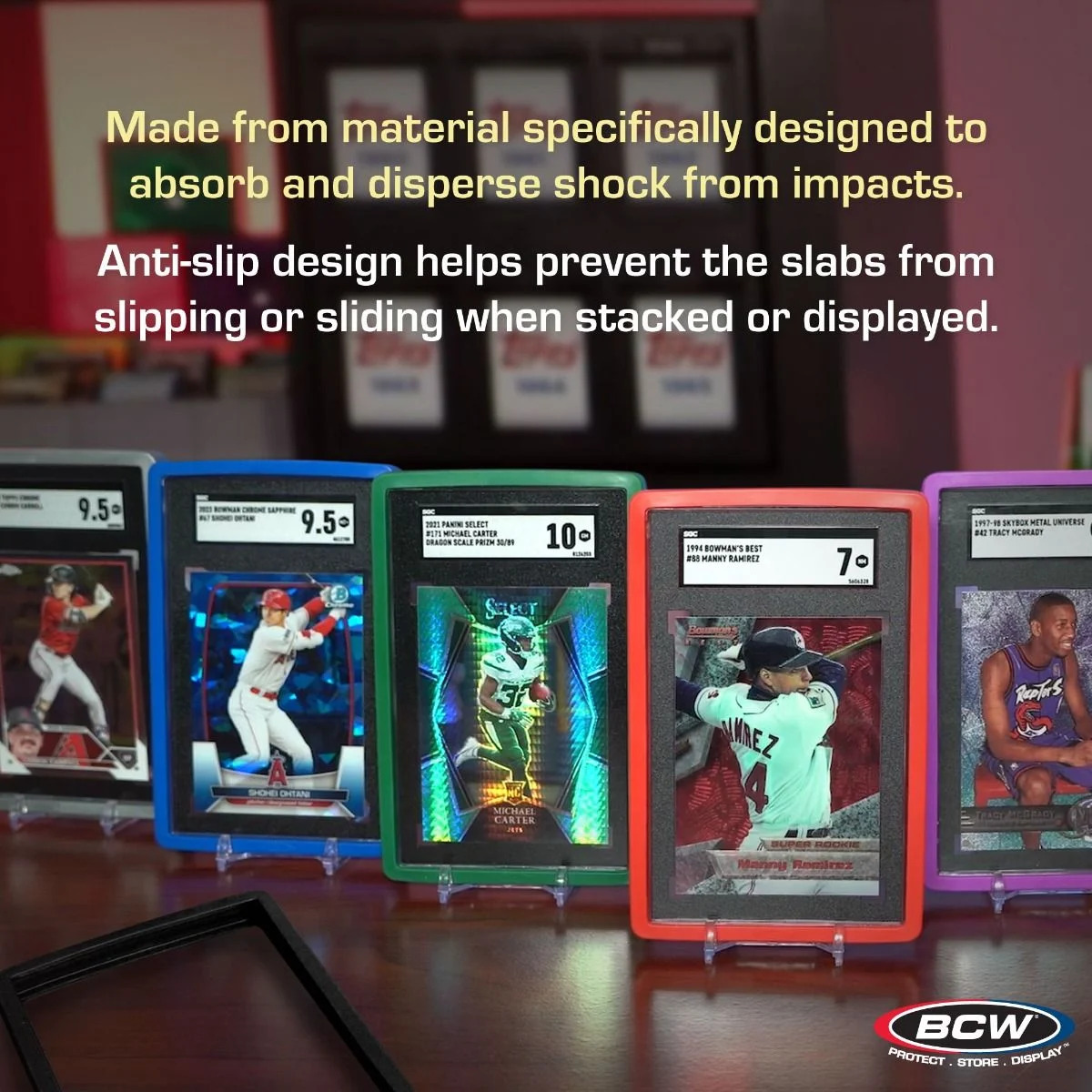 BCW Slab Bumpers are made from orange durable, flexible silicone. They help protect not only the edges of your graded cards from chips and cracking but also the faces of your of your graded cards no longer rub against each other, keeping them in ideal, pristine condition. These are sized to fit standard SGC graded cards.