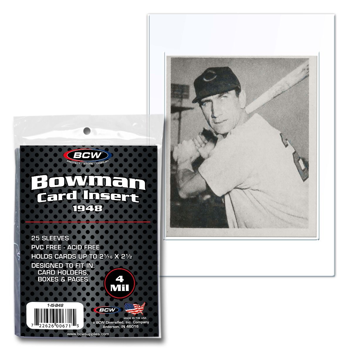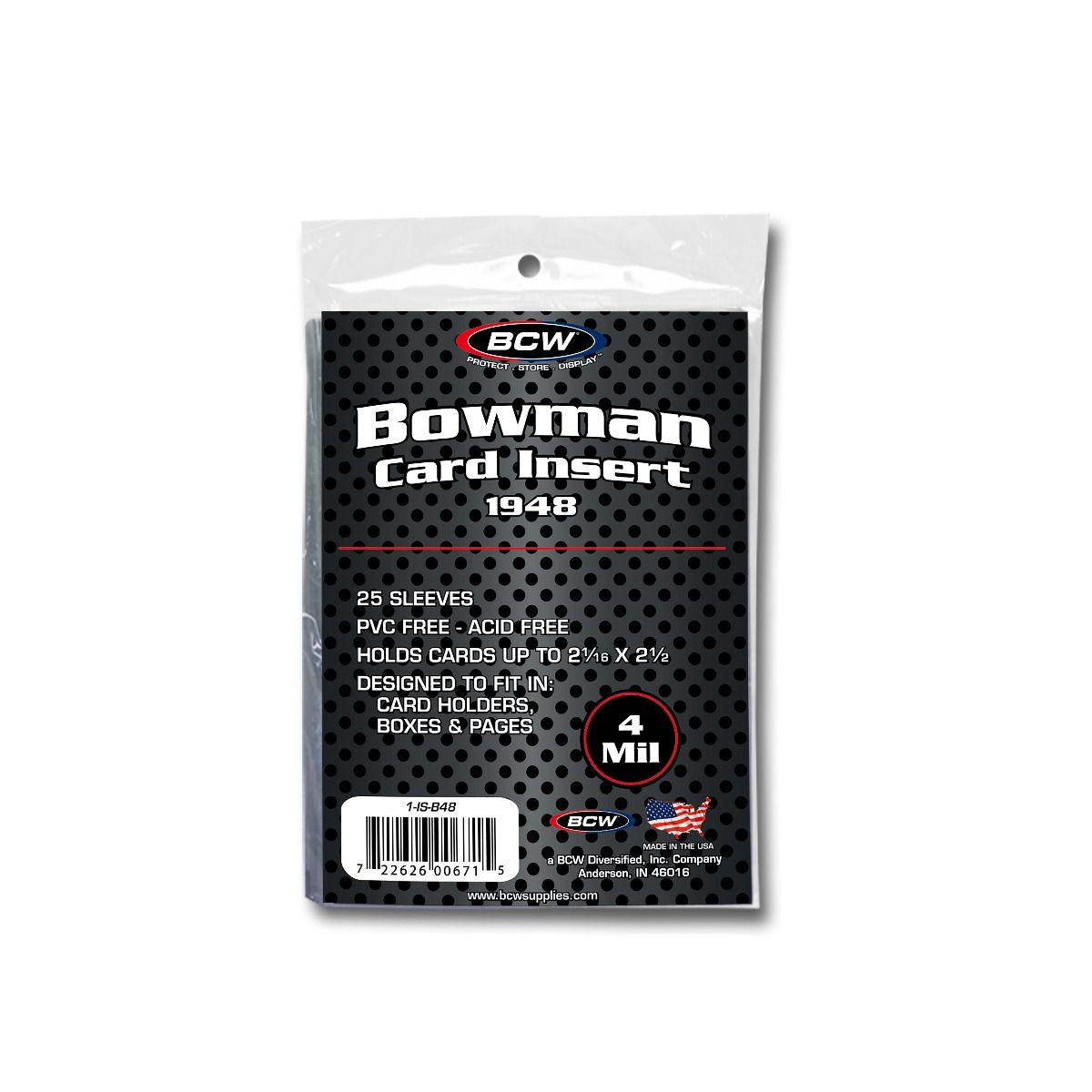 These are designed to fit inside 9-pocket pages, screw-downs, magnetics, snaps, toploaders, and storage boxes. The BCW Bowman '48 Card Insert Sleeve is an acid-free, archival quality product that is designed for the safe long-term protection of your valuable collectible trading cards. This product features high-clarity polypropylene and an inner storage pocket with strong welds. BCW Bowman '48 Card Insert Sleeves fit standard 9-pocket pages and storage boxes. 25 inserts per pack.