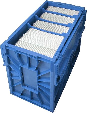 The Blue BCW Short Comic Bin is a heavy duty comic box made from acid-free, reinforced, snap-together panels. The Comic Bin holds about 150 bagged and boarded comics and includes a movable partition that helps stand up your growing stack of comic books. Identification slots on the ends help you mark your boxes with either an index card or a toploading card holder. The lid panels feature sliding locks for added security. Additional Comic Bin Partitions are available separately.