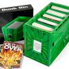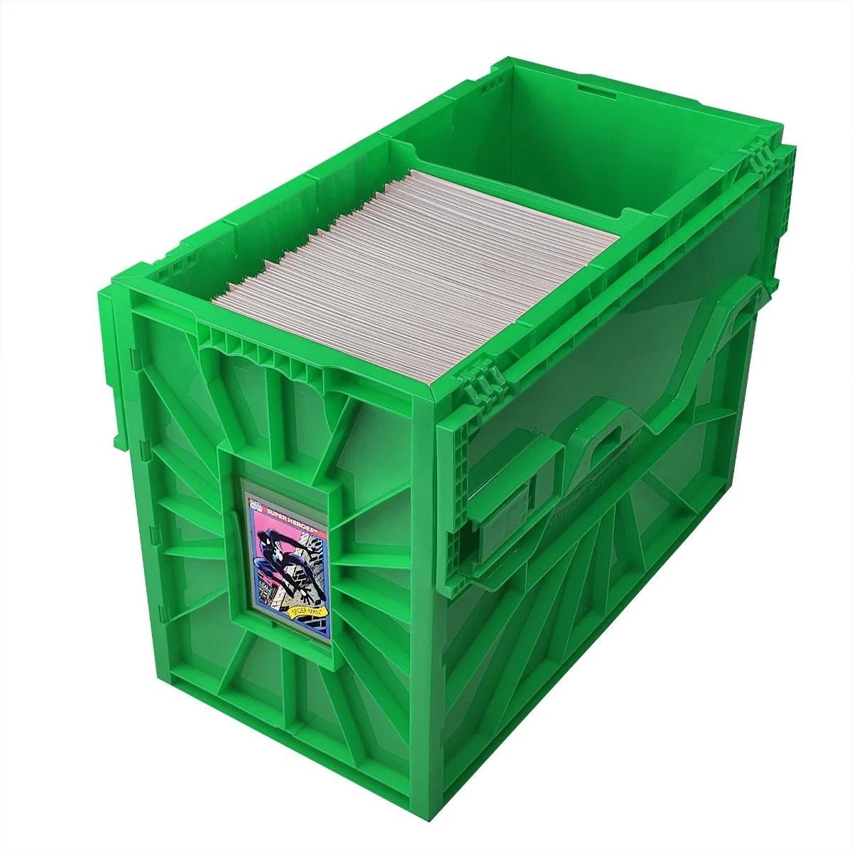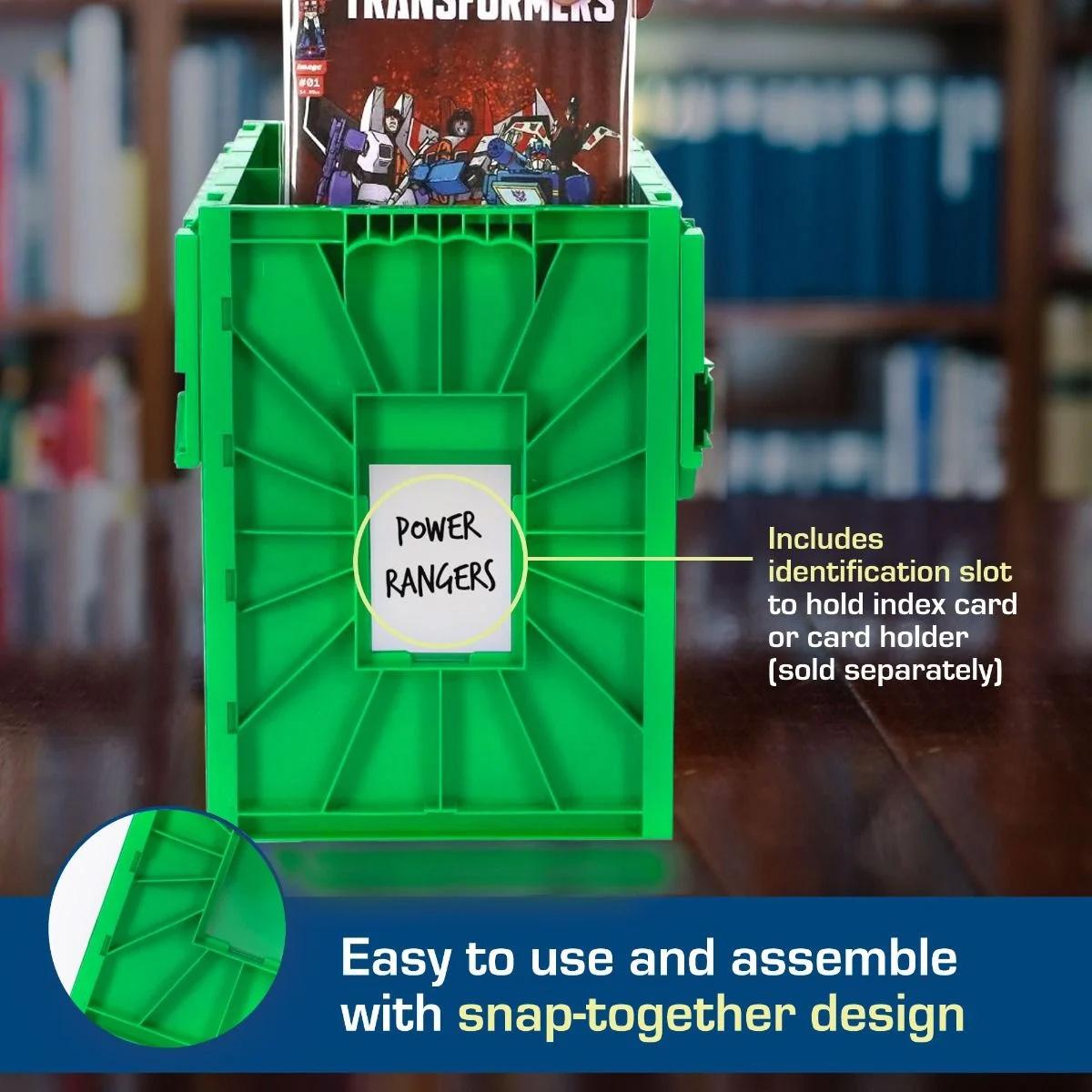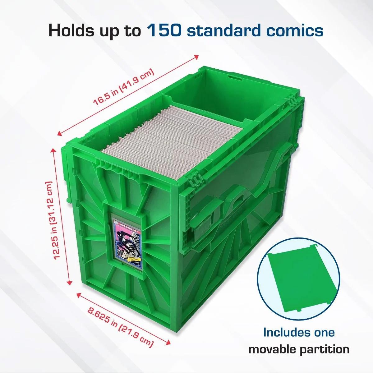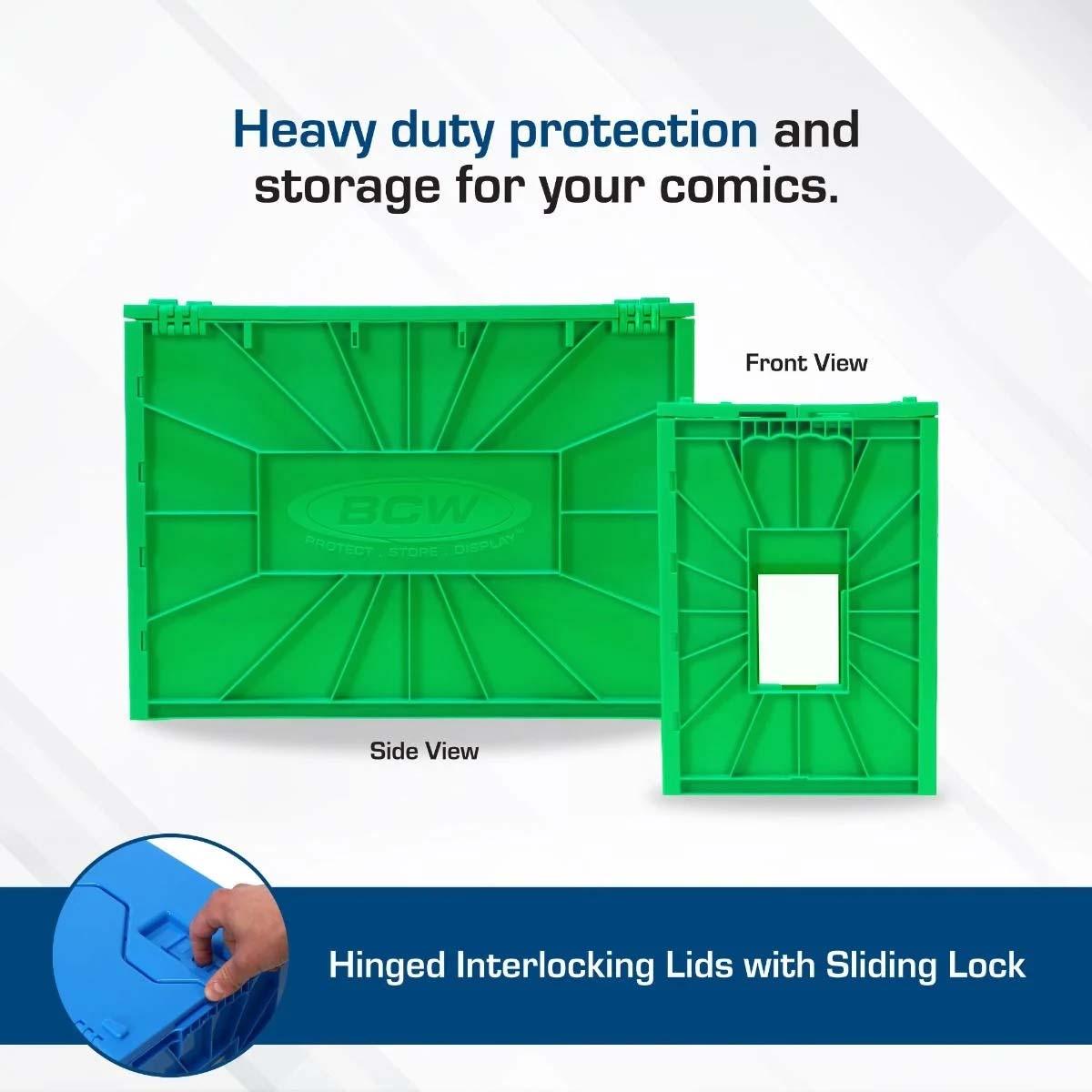 The Green BCW Short Comic Bin is a heavy duty comic box made from acid-free, reinforced, snap-together panels. The Comic Bin holds about 150 bagged and boarded comics and includes a movable partition that helps stand up your growing stack of comic books. Identification slots on the ends help you mark your boxes with either an index card or a toploading card holder. The lid panels feature sliding locks for added security. Additional Comic Bin Partitions are available separately.