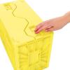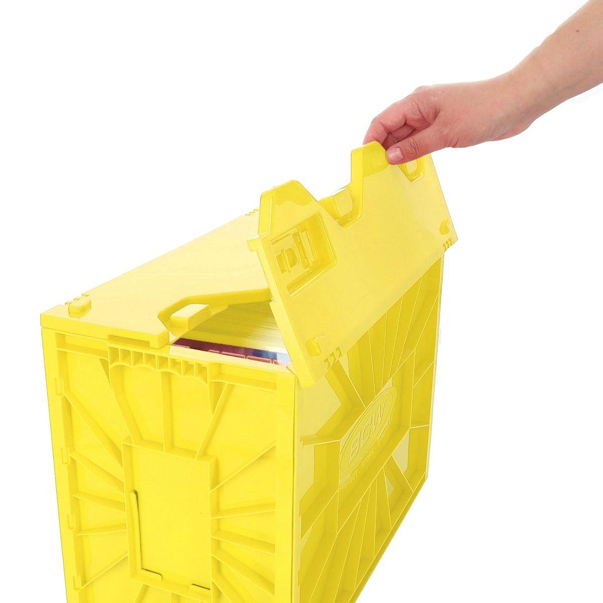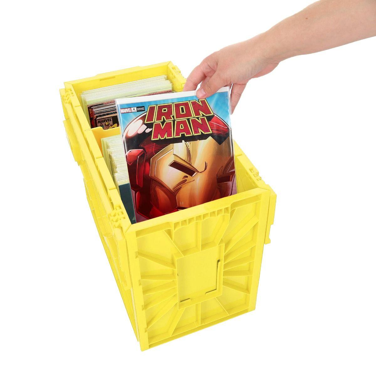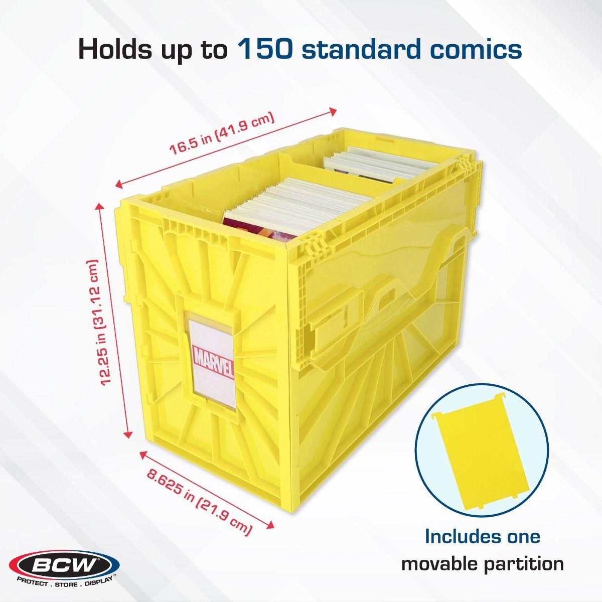 The Yellow BCW Short Comic Bin is a heavy duty comic box made from acid-free, reinforced, snap-together panels. The Comic Bin holds about 150 bagged and boarded comics and includes a movable partition that helps stand up your growing stack of comic books. Identification slots on the ends help you mark your boxes with either an index card or a toploading card holder. The lid panels feature sliding locks for added security. Additional Comic Bin Partitions are available separately.