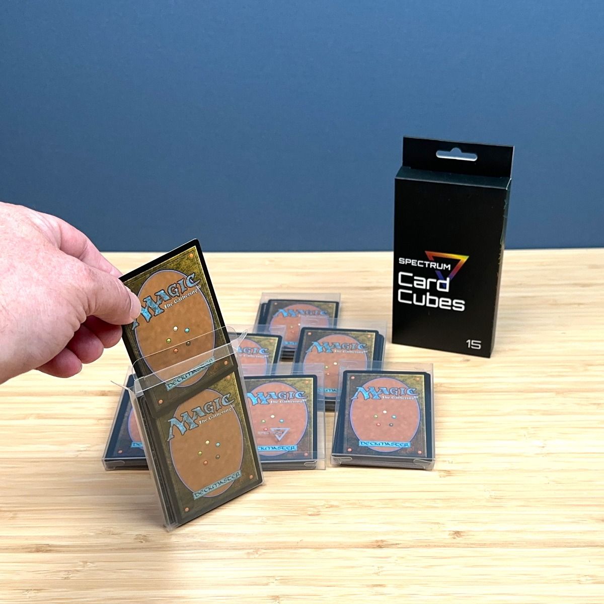 BCW Card Cubes are a simple yet elegant way to store and organize specific sets of cards. The 15-count box is ideal for building draft cubes, holding tokens, or even storing your sideboard. These cubes are made from durable, acid-free PET. The cubes are sized to hold sleeved cards, although the exact capacity depends on the thickness of your cards and sleeves. 12 cubes per pack.