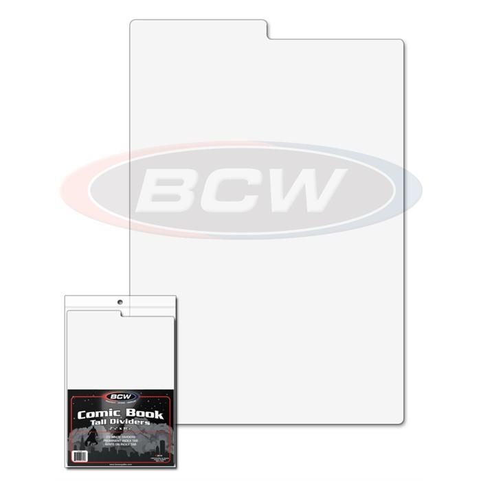 The BCW Comic Dividers are made from a full 30 point white high density Polyethylene Plastic (archival quality), with write-on index tab, and are precision cut to size. Sold in packs of 25 dividers.