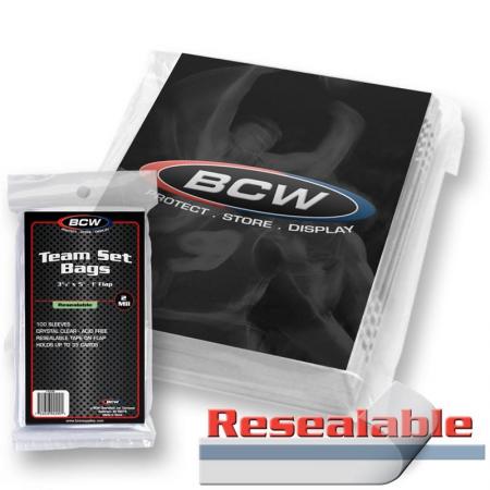 BCW Resealable Team Set Bags are an acid free, archival quality product made of crystal clear polypropylene and have an adhesive strip on the lip. BCW Team Set Bags hold approximately 35 standard cards or 5 toploaders. These also work great to enclose toploaders and magnetics to ensure the cards stay in the holders. Team Set Bags hold all thicknesses of standard toploaders, and magnetic card holders up to 180 points. One-inch flap with adhesive strip for closure. Sold in packs of 100 bags.