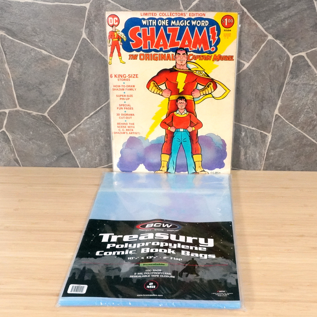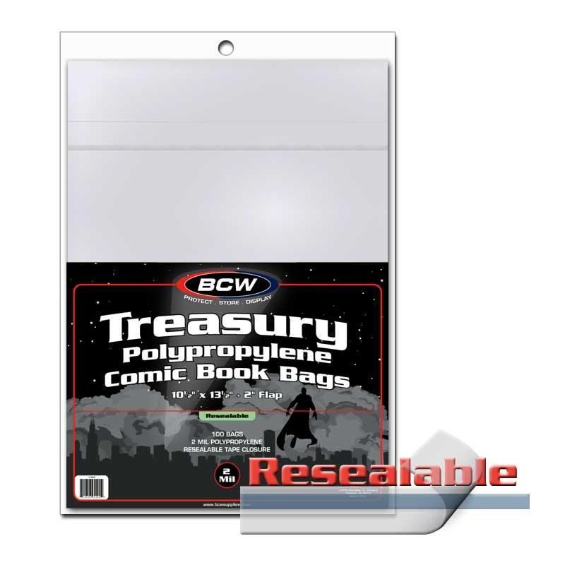 The BCW Resealable Treasury Comic Bags are an acid free, archival quality product made of crystal clear polypropylene. These bags have a reusable adhesive tape strip on the body of the bag so the collector can fold the top flap over and lock in the comic. Use this item to protect and store your collectible treasury comics. 100 bags per pack.