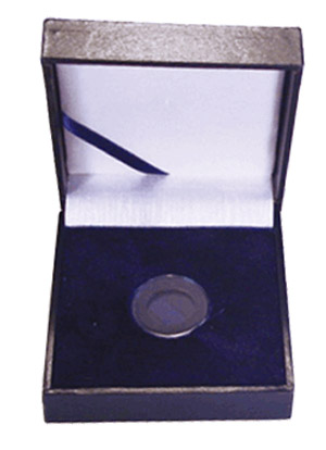 An attractive blue leatherette box with horizontal ribbon. These boxes are perfect for displaying and packaging coins in round, Air-Tite holders. The boxes are designed with a pre-formed insert that is sized to hold Air-Tite holders. This box is sized for A size Air-Tite holders.