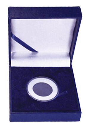 An attractive blue leatherette box with horizontal ribbon. These boxes are perfect for displaying and packaging coins in round, Air-Tite holders. The boxes are designed with a pre-formed insert that is sized to hold Air-Tite holders. This box is sized for H size Air-Tite holders.